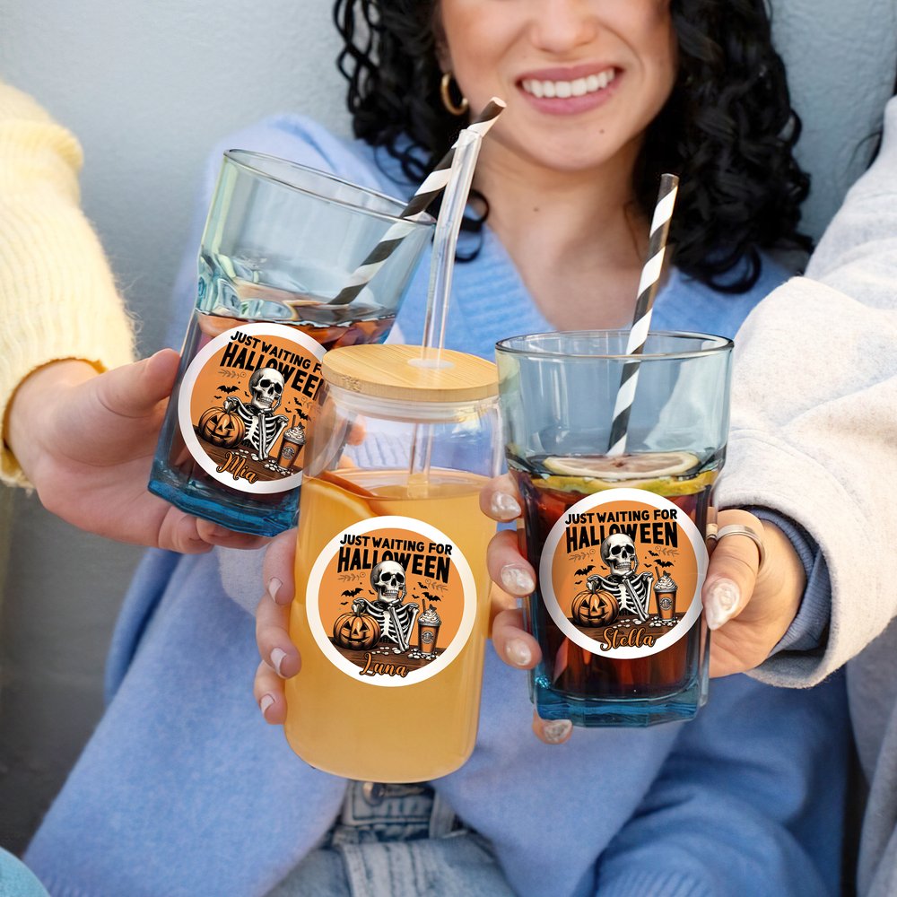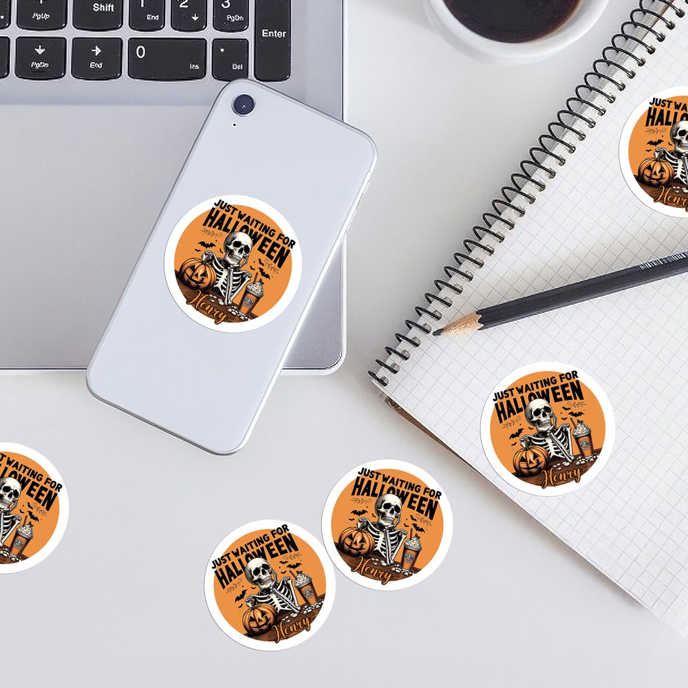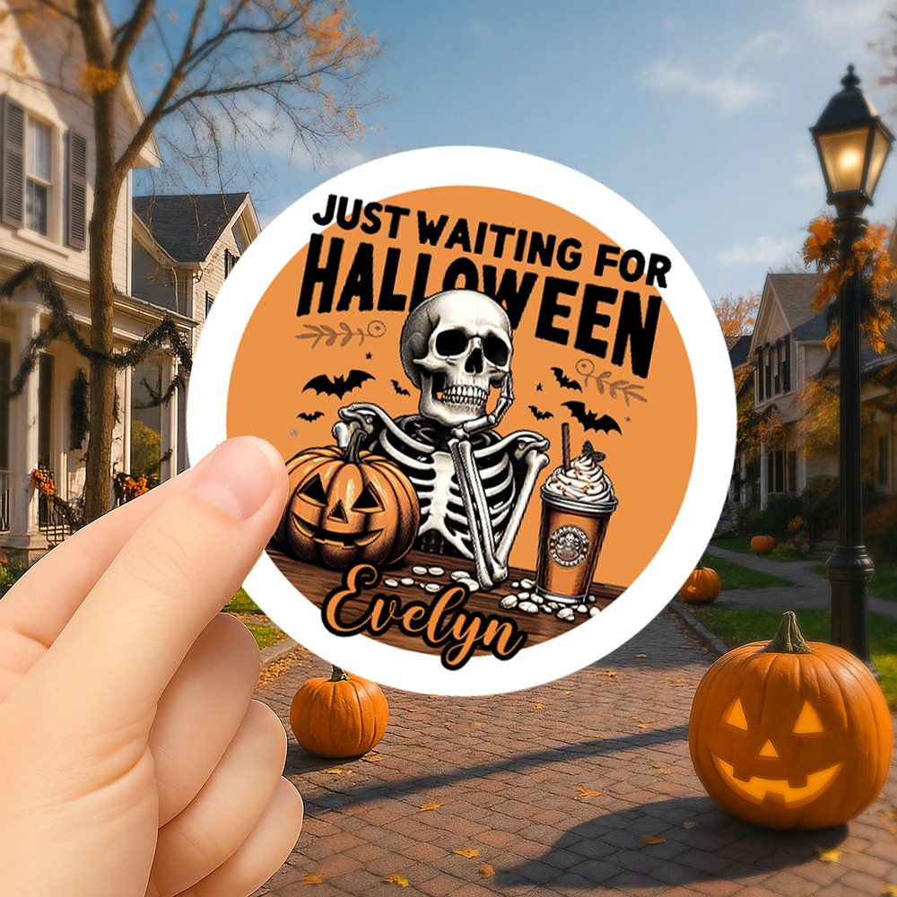 Questi adesivi divertenti e spettrali raffigurano uno scheletro giocoso, con il mento in mano, che riposa su un tavolo pensando. Sul tavolo sono presenti caffè, zucche e pipistrelli, oltre alla didascalia "Just Waiting For Halloween", perfetta per creare l'atmosfera. Gli adesivi sono personalizzabili con il vostro nome e rappresentano il tocco finale ideale per l'arredamento della vostra festa.