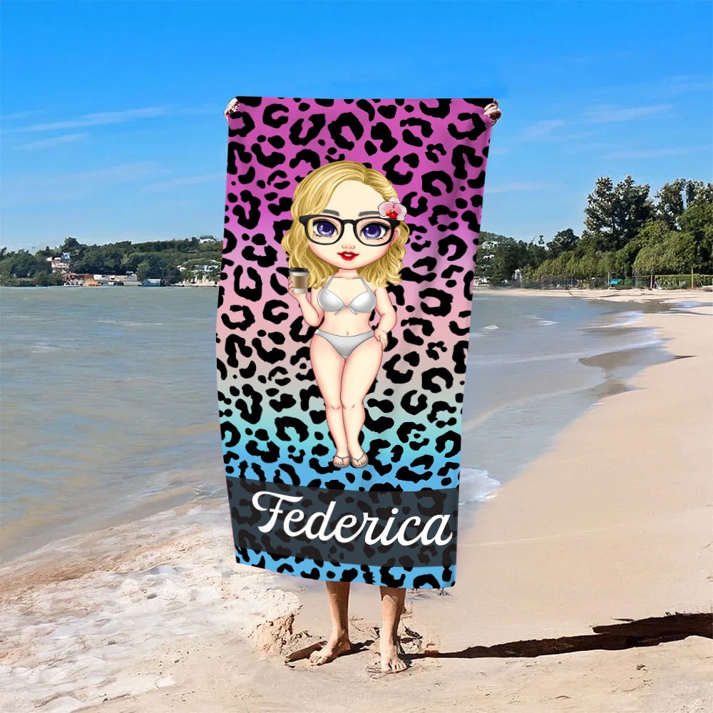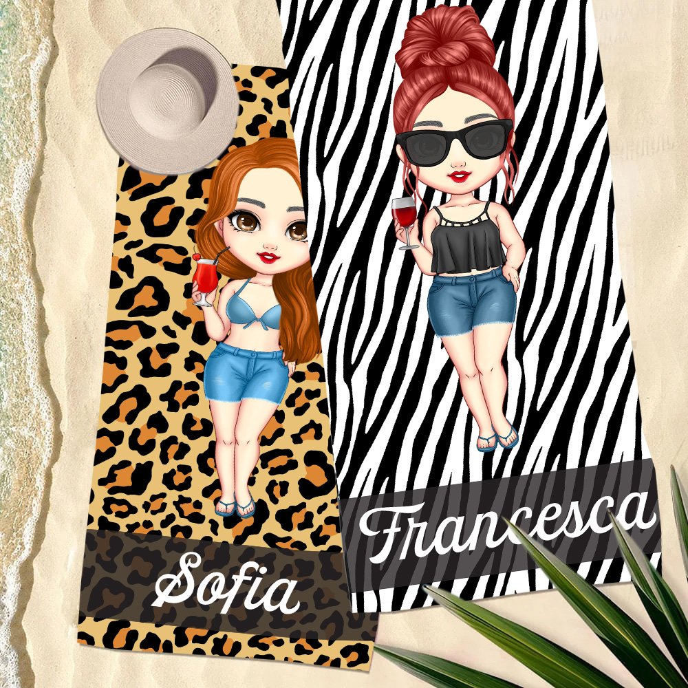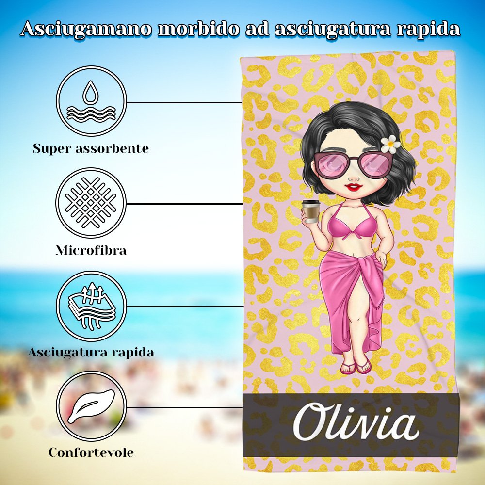 Il design di questo asciugamano da spiaggia è vivace e accattivante. Presenta costumi di personaggi in stile vacanza balneare, abbinati a fantasie leopardate e zebrate alla moda. Puoi personalizzarlo con il tuo nome. Combinazioni giocose di colori e motivi aggiungono un tocco divertente e trendy al tuo look sulla spiaggia.