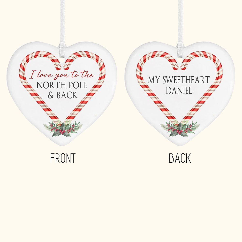 Ornamento personalizzato a forma di cuore con amore fino al Polo Nord e ritorno, in ceramica con bastoncini di zucchero, ciondolo da appendere all'alb