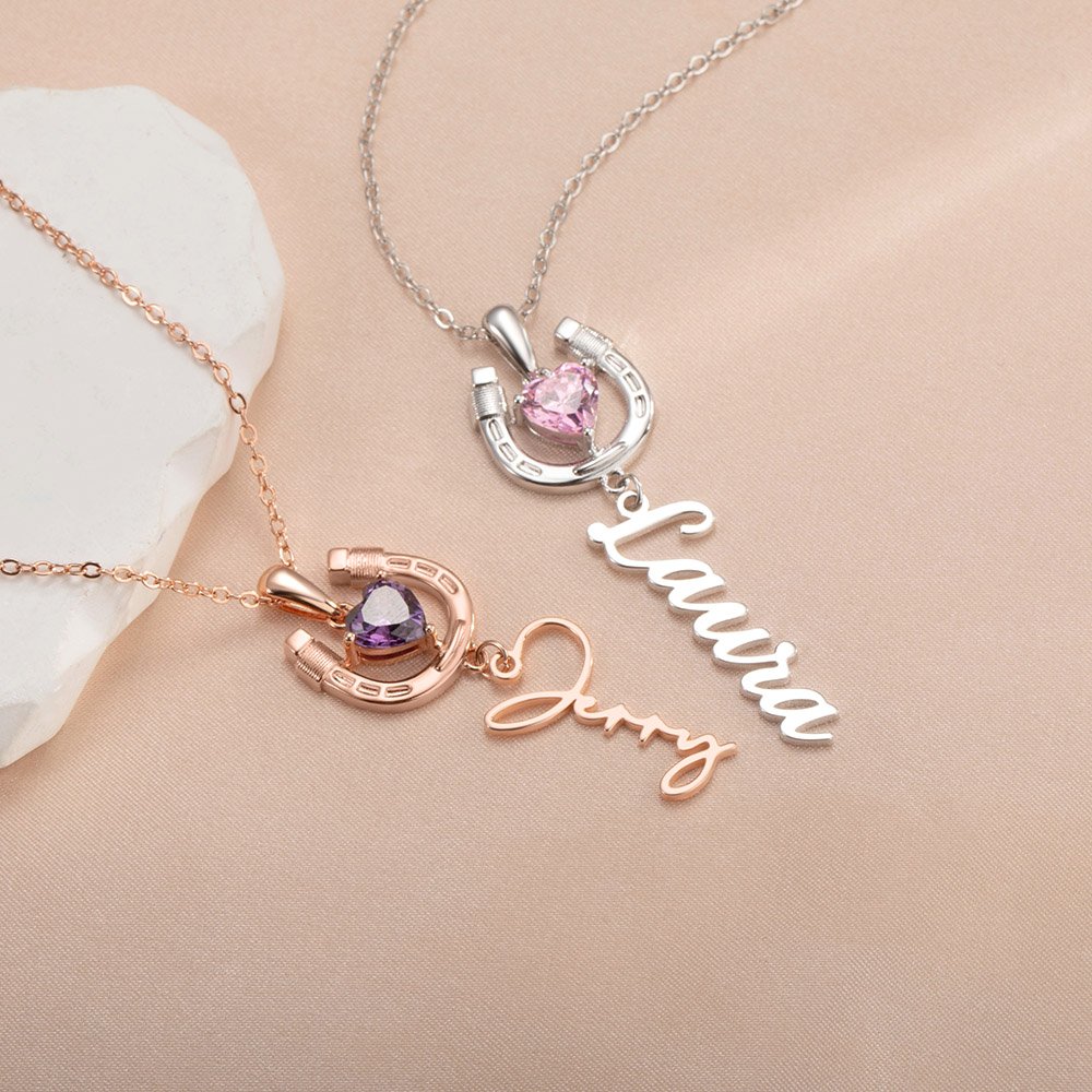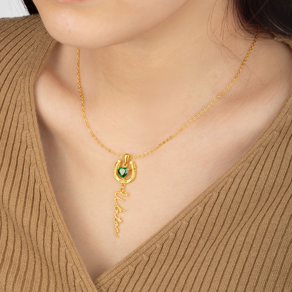 Questa collana, dal design elegante a forma di ferro di cavallo, è arricchita da una scintillante pietra natale a forma di cuore, simbolo di amore e fortuna. Il ferro di cavallo porta fortuna, mentre la pietra natale rappresenta l'amore: un gioiello che unisce questi due significati. Puoi anche personalizzarla con il tuo nome, aggiungendo un tocco unico e rendendo il tuo stile ancora più speciale.