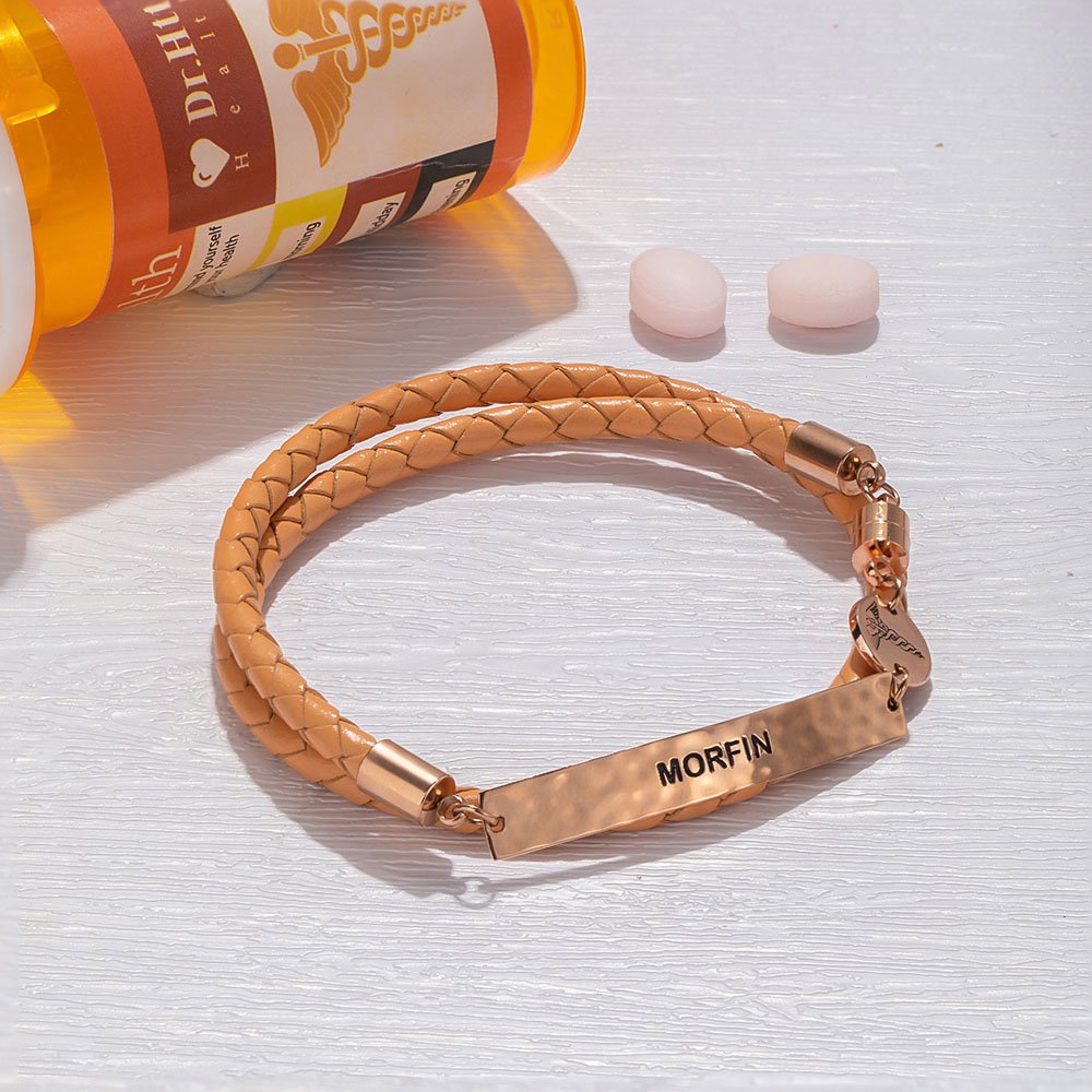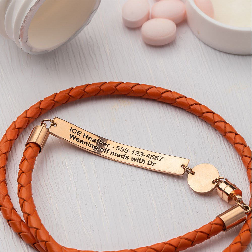 Il nostro braccialetto è caratterizzato da un design unico a doppia treccia in pelle con una targhetta identificativa martellata, che aggiunge raffinatezza e stile a qualsiasi look. Una robusta chiusura magnetica assicura che il braccialetto sia ben saldo al polso, rendendolo facile da indossare e da togliere, particolarmente utile in caso di emergenza. Questo perfetto mix di stile e praticità rende questo braccialetto l'accessorio perfetto per tutti i giorni.