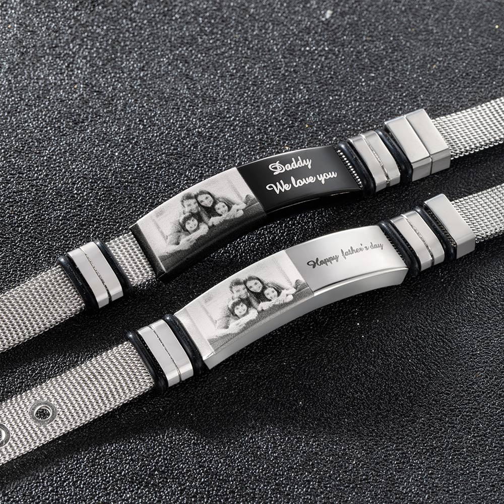Questo braccialetto da uomo può essere personalizzato con i momenti più cari che avete vissuto con la persona amata, caricando una foto, e personalizzato con un messaggio speciale per dire al destinatario quanto sia importante per voi. I testi più comuni includono nomi, date, parole sentimentali, ecc. È possibile scegliere il nero o il platino. È una benedizione vedere qualcuno che si ama ogni giorno.