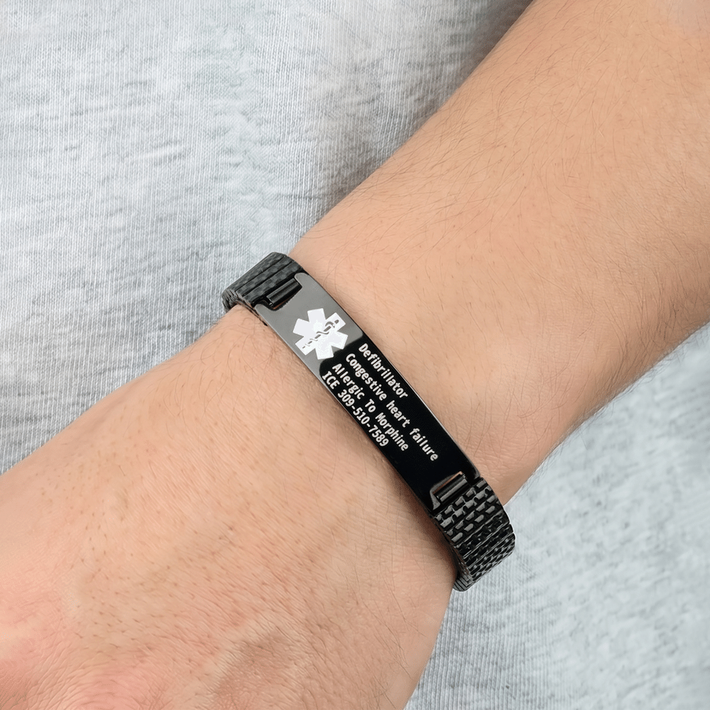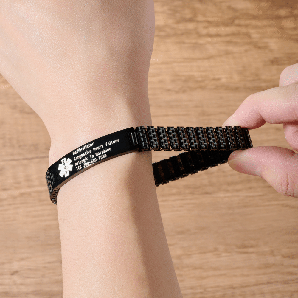 Questo braccialetto è un accessorio pratico e alla moda. Può essere inciso con informazioni importanti, tra cui le condizioni mediche, i farmaci di emergenza e i numeri di contatto, per garantire che il personale medico possa ottenere facilmente le informazioni chiave in caso di emergenza. È stato progettato per persone affette da patologie particolari come epilessia, diabete e allergie. È disponibile in tre colori: platino, oro e nero per creare un articolo unico.