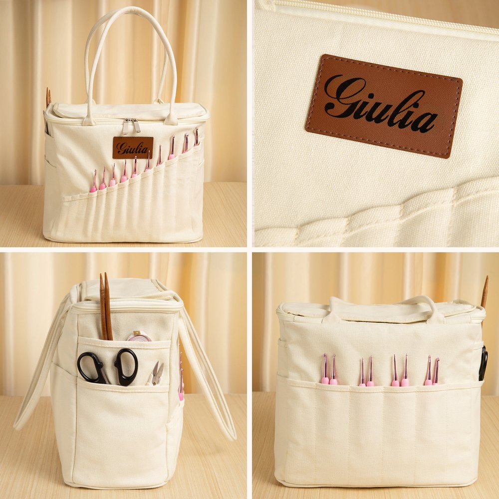 Questa semplice borsa per filati utilizza una palette di colori caldi e a bassa saturazione che crea un effetto armonioso e accogliente. L'etichetta in pelle PU sulla parte frontale può essere personalizzata con il tuo nome o le tue iniziali, aggiungendo il tuo stile personale. Questo la rende diversa dalle normali borse per filati, migliorando non solo la sua bellezza, ma anche facendola diventare un accessorio alla moda per le tue creazioni fatte a mano.