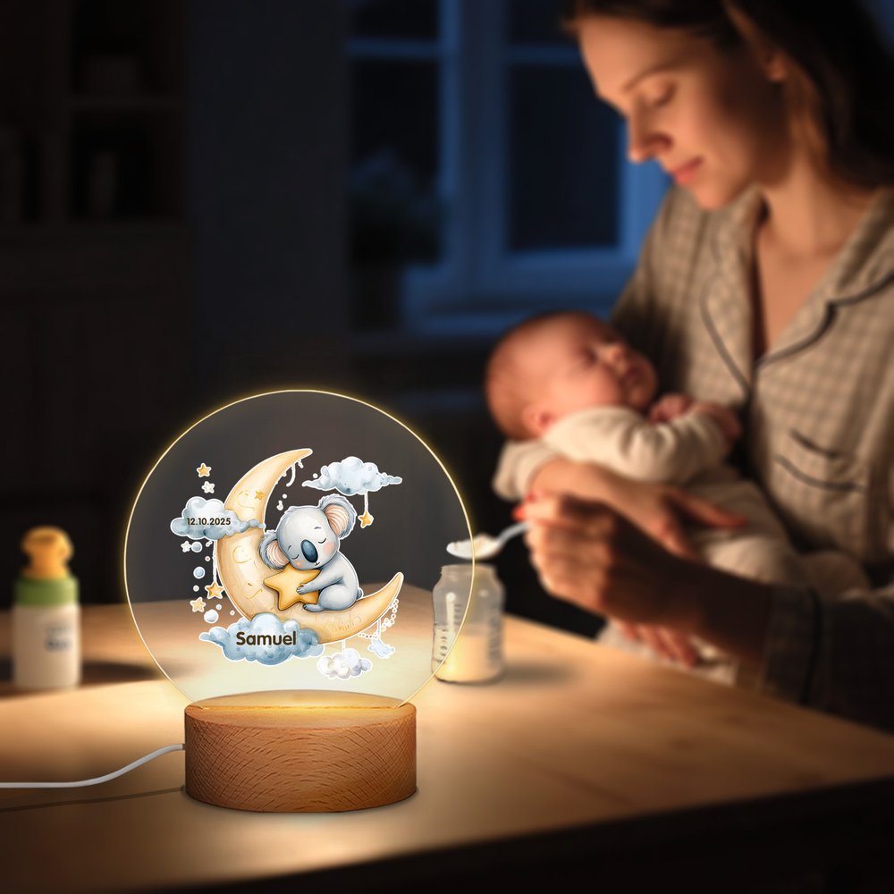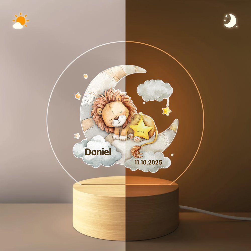 Questa luce notturna presenta un delicato motivo lunare, circondato da stelle e nuvole. Ci sono 20 animali dei cartoni animati che si raggomitolano sulla luna o si accoccolano tra le nuvole, con posture carine e innocenti, che mostrano la loro innocenza infantile. Nomi e date personalizzabili possono essere stampati su lastre acriliche, abilmente integrate con elementi di stelle, luna e animali, rendendo la luce notturna un'opera d'arte unica e giocosa.