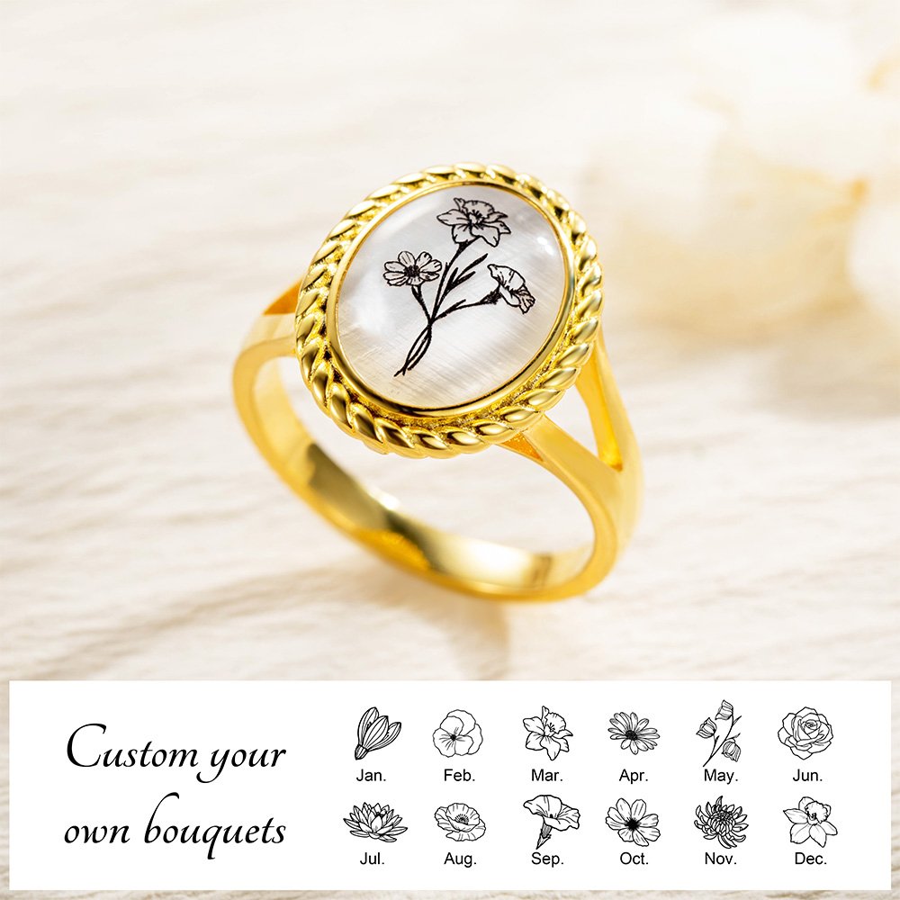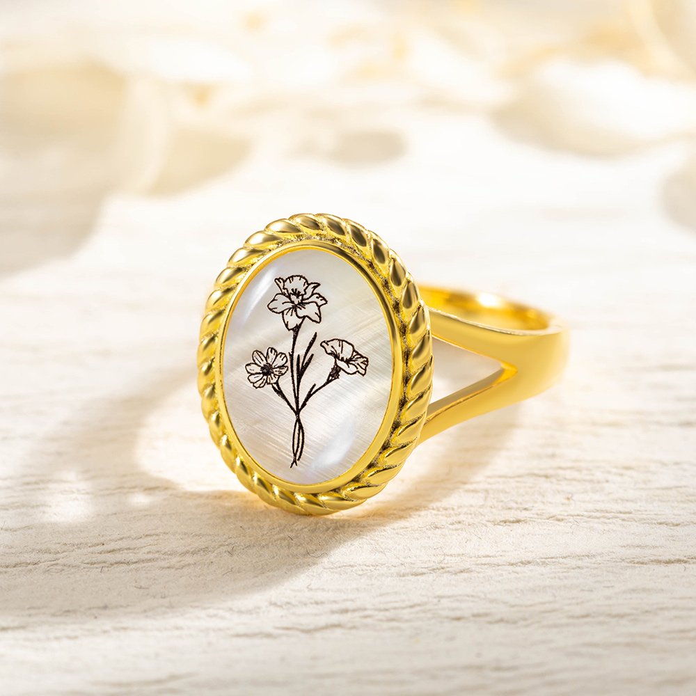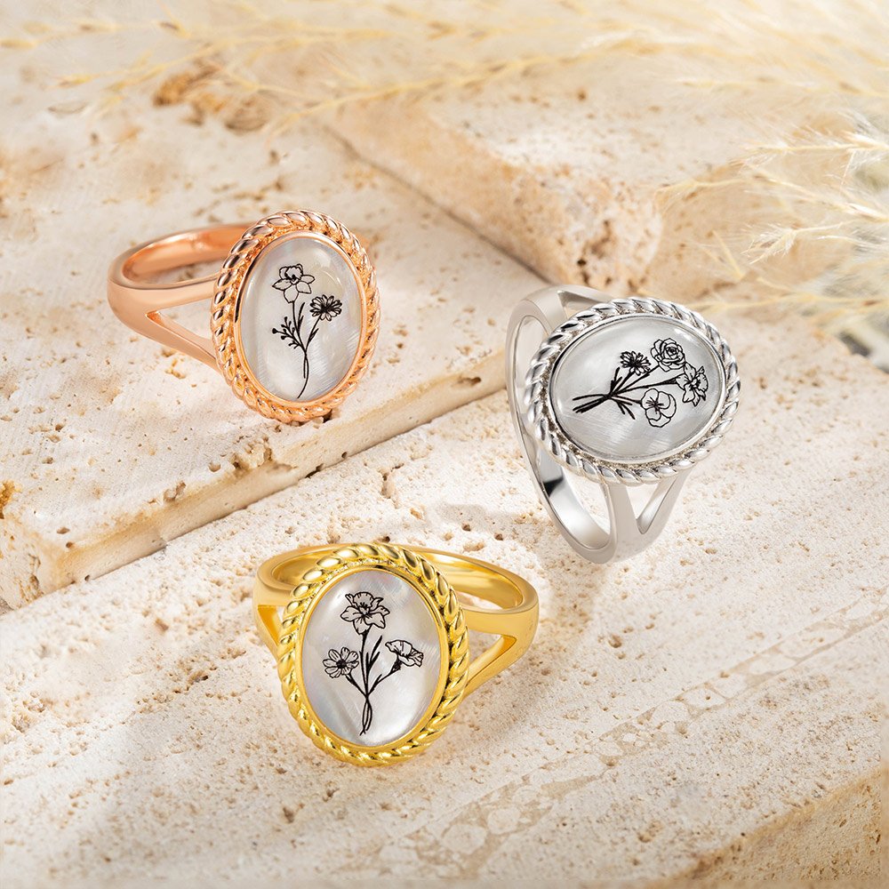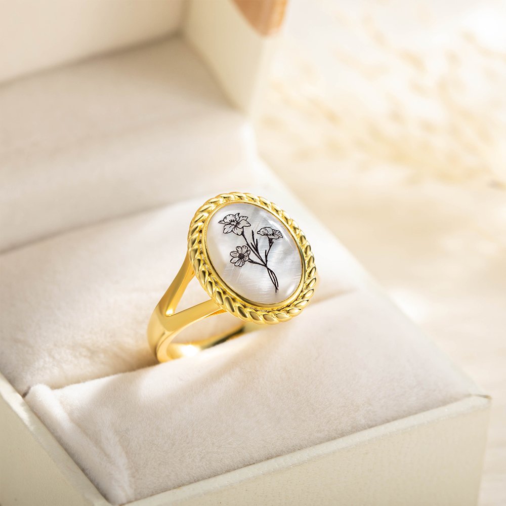 Questo anello utilizza una madreperla splendidamente incorniciata come disegno principale, aggiungendo l'elemento del fiore di nascita per rendere l'insieme più elegante e raffinato. I diversi fiori di nascita hanno significati diversi e rappresentano diverse benedizioni, e questo significato viene dato all'anello per renderlo più unico e personalizzato, in modo che questa bellezza accompagni sempre chi lo indossa.