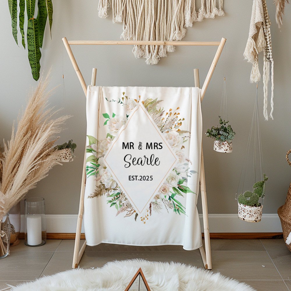 La nostra coperta personalizzata vi permette di creare un regalo davvero unico e commovente. Potete personalizzarla con il nome della famiglia della coppia. La coperta è elegantemente decorata con il titolo "MR & MRS", seguito dal nome della famiglia, creando un ricordo unico e sentito.