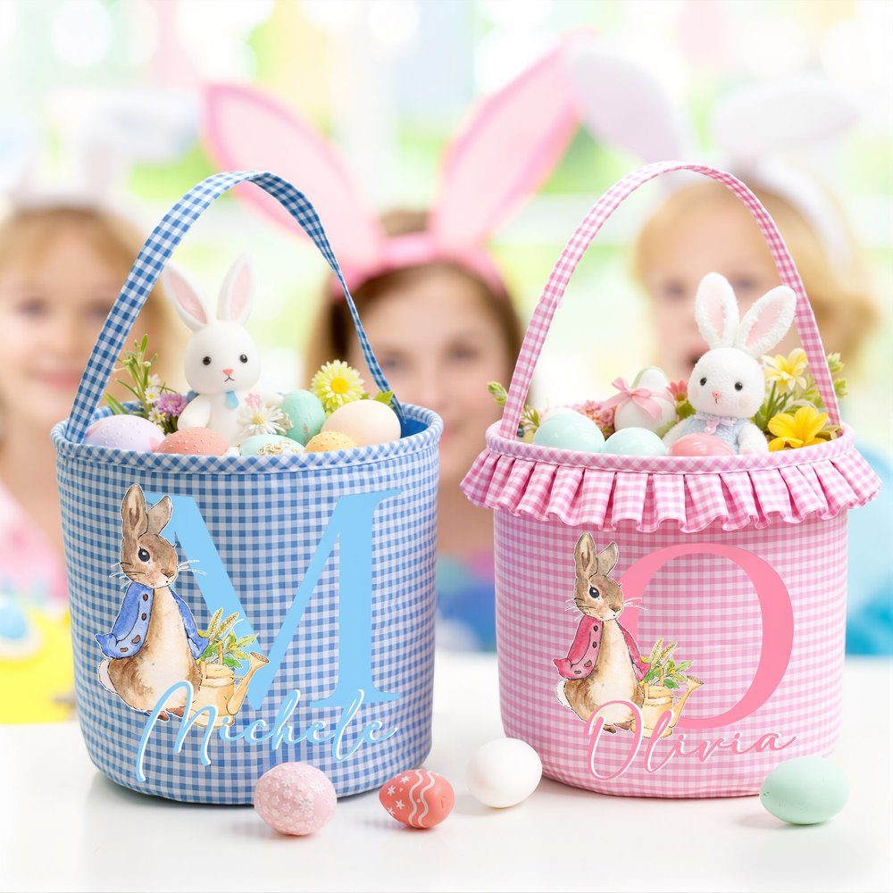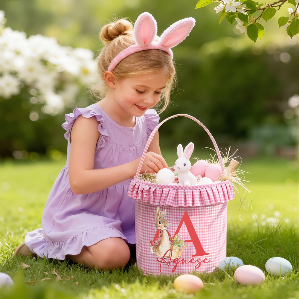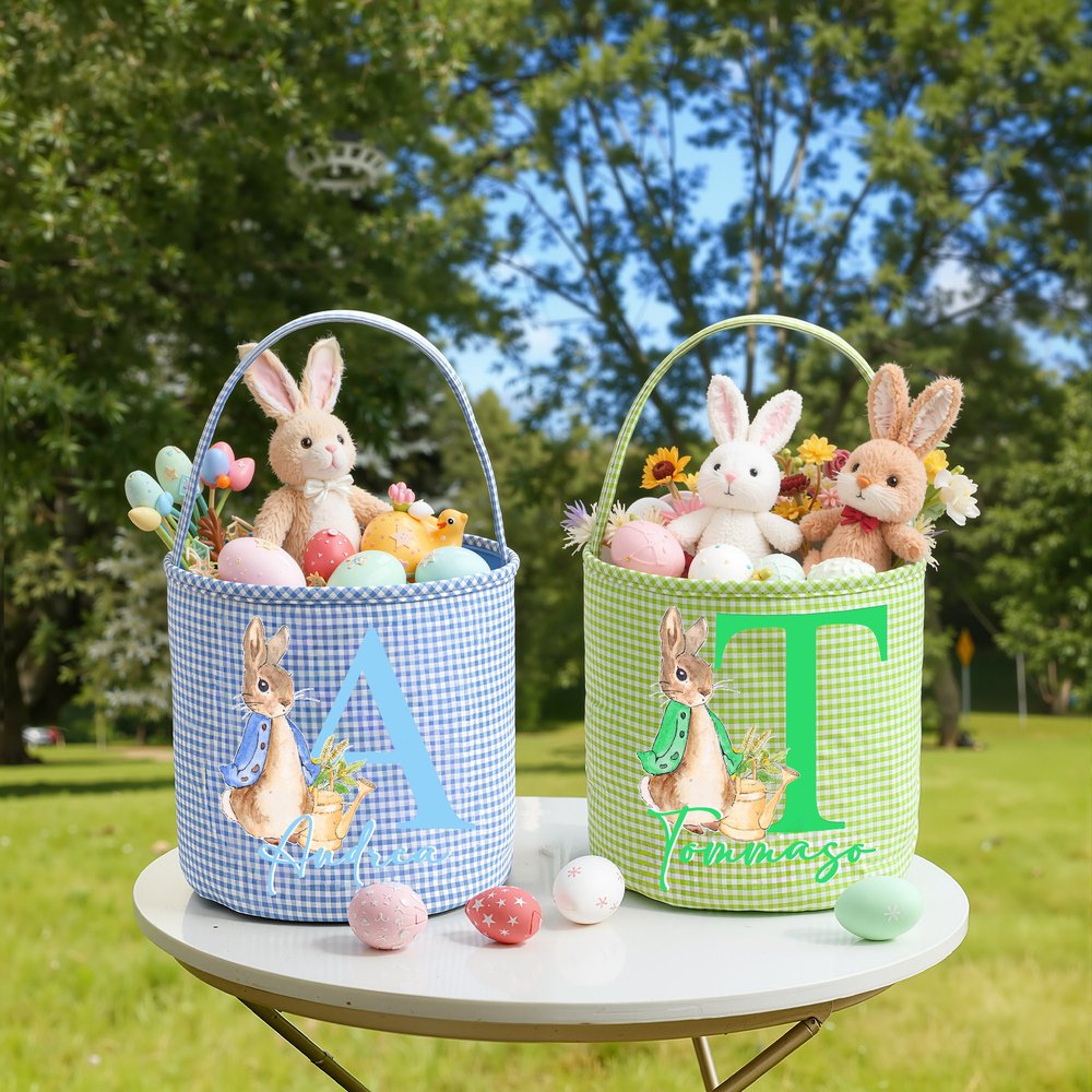 Il tuo cestino pasquale ha il classico motivo con Peter Rabbit al centro e può essere personalizzato con il nome e le iniziali del tuo bambino, rendendolo unico e festoso. Le stampe allegre e il nome personalizzato si combinano perfettamente per portare subito gioia e colore durante la Pasqua.
