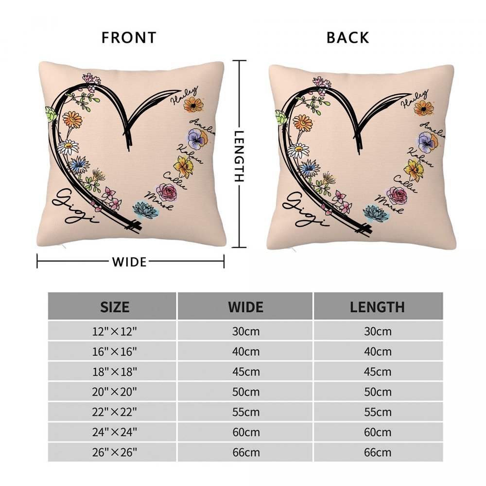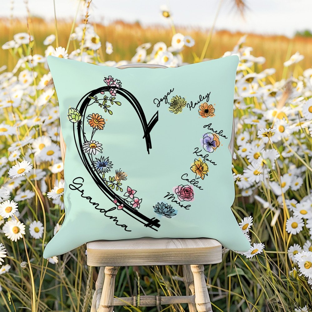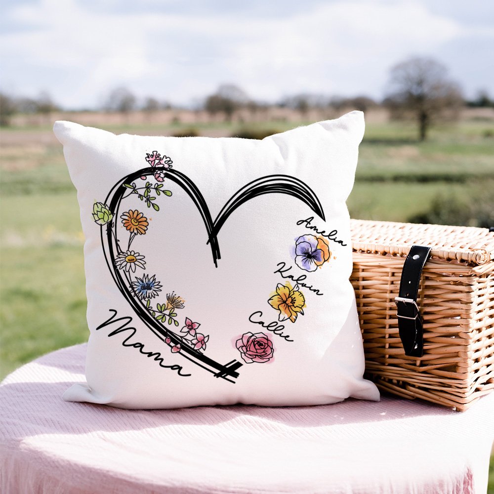 Vi presentiamo questo copricuscino, perfetto connubio tra comfort e sentimento! Con il filo nero che si intreccia in un cuore, un ramo di fiori colorati a sinistra e 1-6 fiori di compleanno a scelta a destra, a seconda del mese di nascita, formano una bellissima corona. È inoltre possibile personalizzarla aggiungendo nomi e titoli, rendendola un tesoro unico che celebra il legame speciale tra voi e i vostri cari.