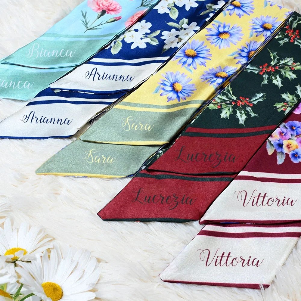 Questa sciarpa con fascia personalizzata è l'accessorio perfetto per chi ama distinguersi. Puoi scegliere tra vivaci colori di base e aggiungere il fiore del mese del tuo compleanno insieme al tuo nome, per creare un pezzo unico e personale.