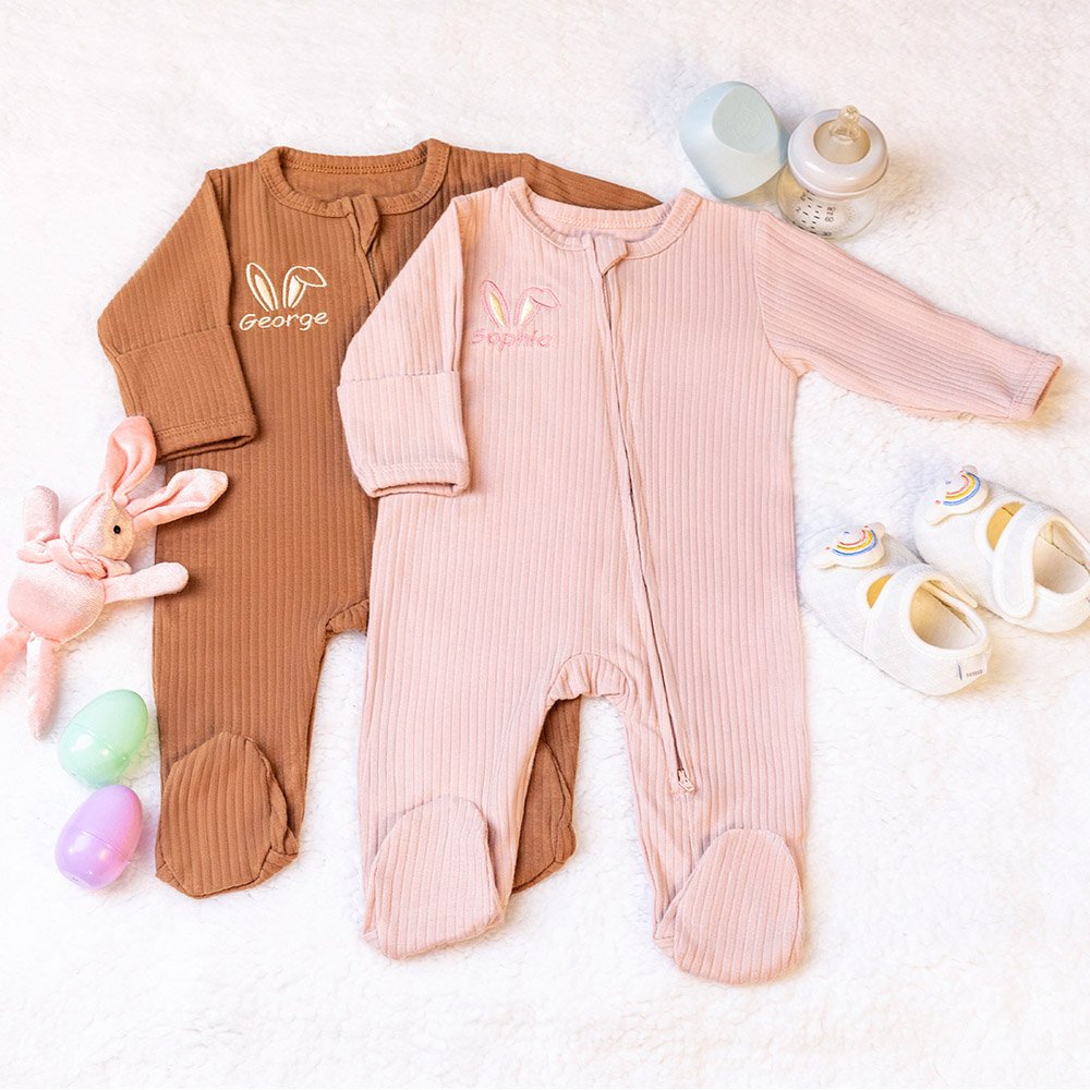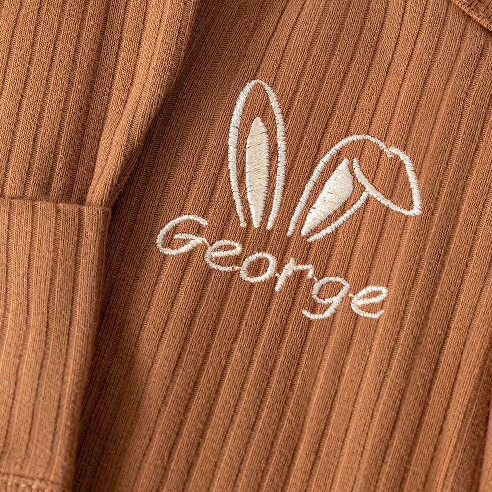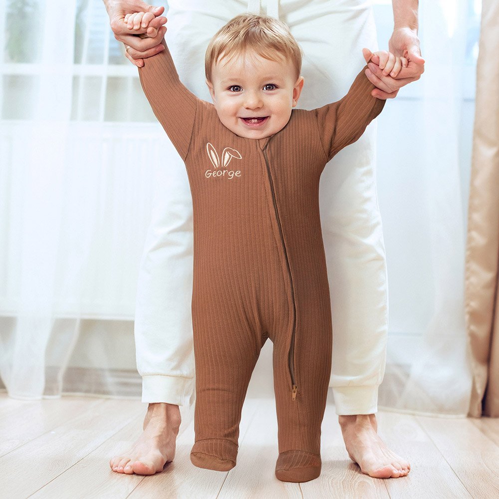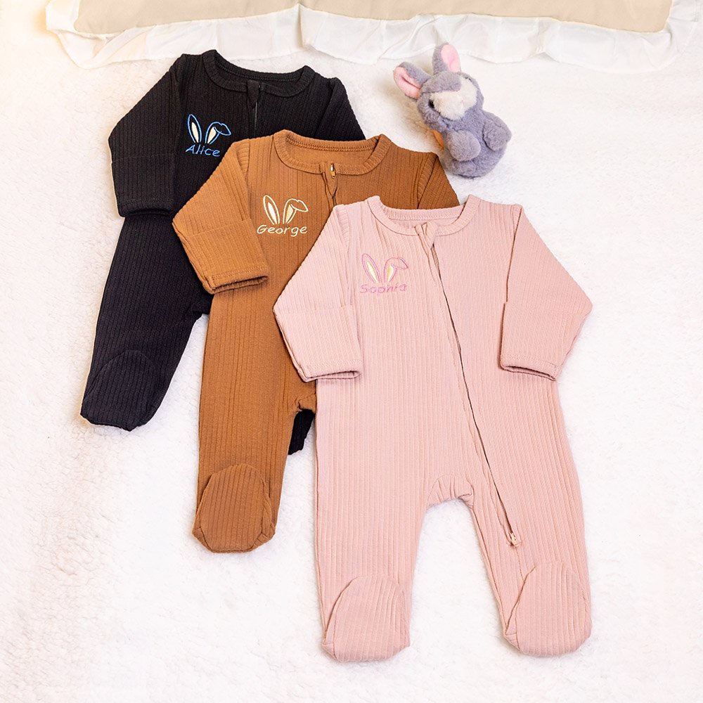 Questa tutina per neonati è disegnata con orecchie da coniglietto, simpatiche e innocenti. Viene fornito un servizio di personalizzazione e il nome del bambino viene ricamato con cura sulla tutina. Ogni punto e ogni filo sono pieni di amore esclusivo per il bambino, creando abiti unici per la casa del vostro bambino.