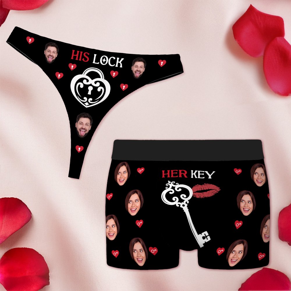 Questo perizoma da donna e intimo da uomo personalizzabile per la coppia di San Valentino ha come tema "Il lucchetto di lui" e "La chiave di lei". È possibile caricare i propri avatar, impreziositi da dettagli giocosi come chiavi e impronte di labbra. Lo sfondo nero mette in risalto i motivi rossi e bianchi. Lo stile complessivo è dolce e alla moda. Combinando un design divertente e la personalizzazione, si crea un regalo pieno di amore e creatività per le coppie.