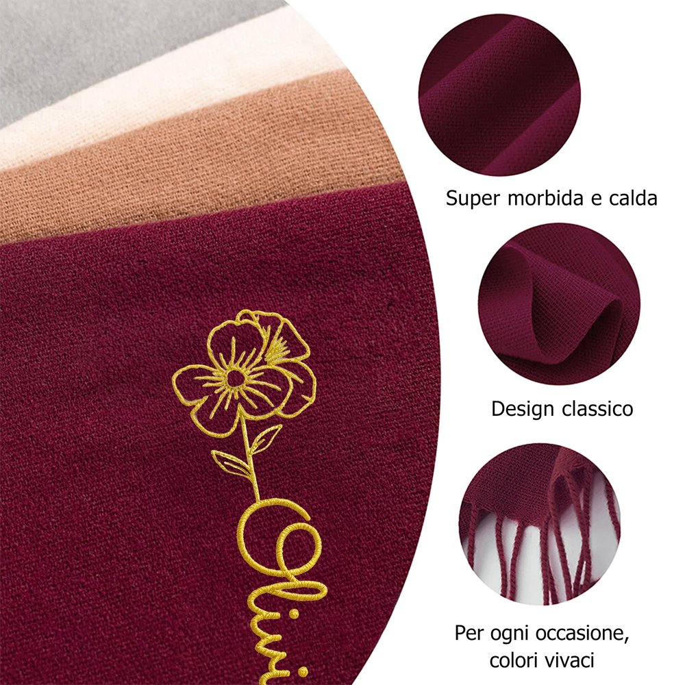Questa sciarpa finemente realizzata presenta un design personalizzato con il tuo fiore di nascita, accompagnato da nomi ricamati con cura. Ogni motivo floreale ha un significato speciale, mentre il ricamo del nome trasforma questo accessorio in un capo unico. Disponibile in diversi colori di sciarpa con ricami multicolore coordinati, per un’armonia perfetta tra sfondo e dettagli decorativi.