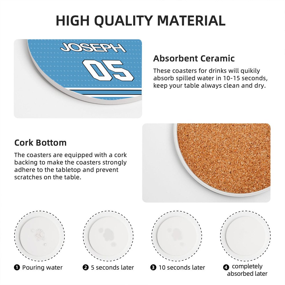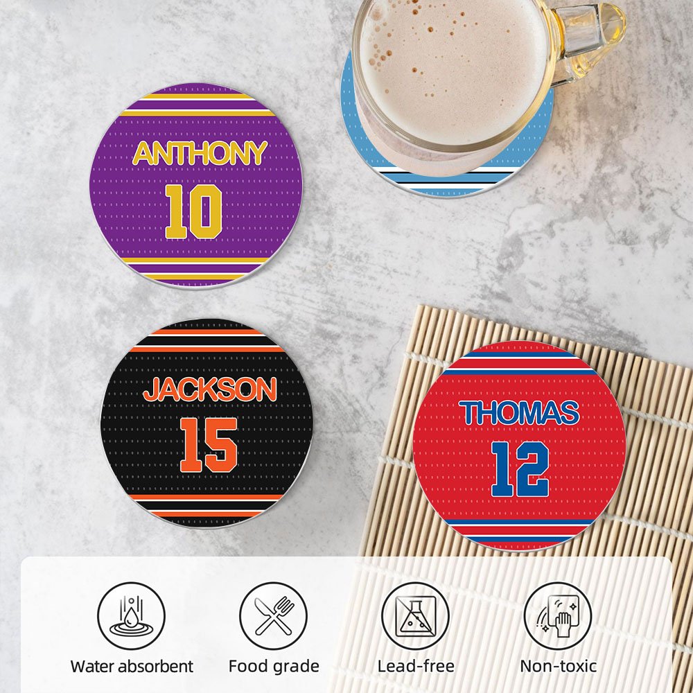 Questi sottobicchieri sono caratterizzati da un vivace design ispirato al jersey sportivo; è possibile personalizzare ogni sottobicchiere con il nome e il numero di maglia dell'atleta, creando un set personalizzato e unico nel suo genere, ideale per gli appassionati di sport e i giocatori.