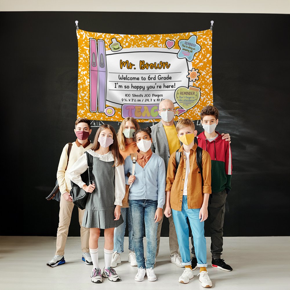 Questo arazzo in stile libro di composizione rende l'aula vivace e interessante, aggiungendo entusiasmo e vitalità alla classe. È possibile scegliere tra diversi colori e personalizzare il nome e il testo dell'insegnante per rendere l'arazzo un pezzo unico della classe.