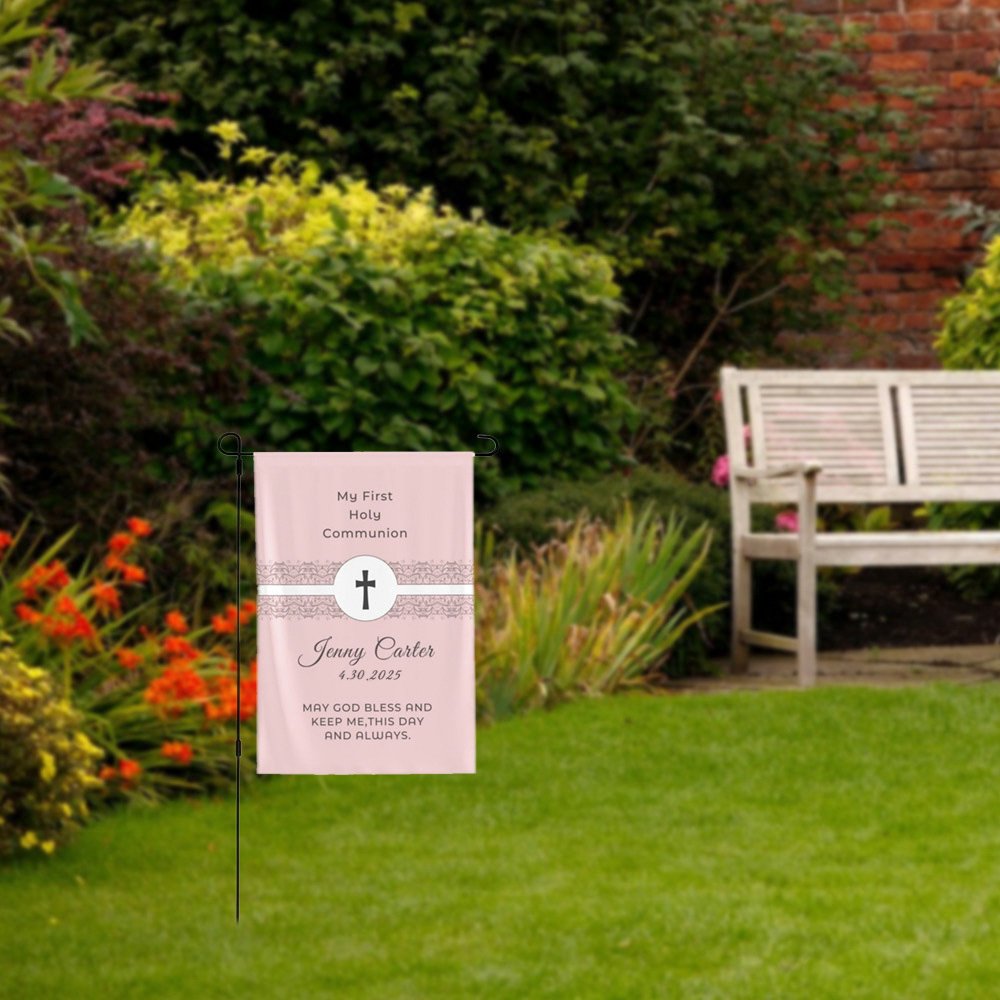 Festeggiate la prima comunione del vostro bambino con la nostra bandiera da giardino personalizzata. La bandiera da giardino presenta un disegno personalizzabile che include il nome del destinatario e la data della prima comunione. Questa personalizzazione la rende un regalo unico per i vostri familiari o amici, creando un ricordo duraturo.