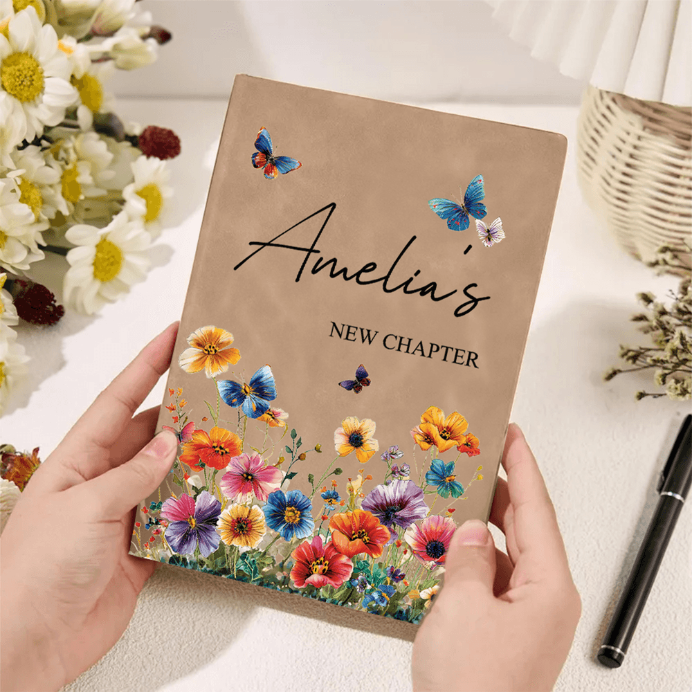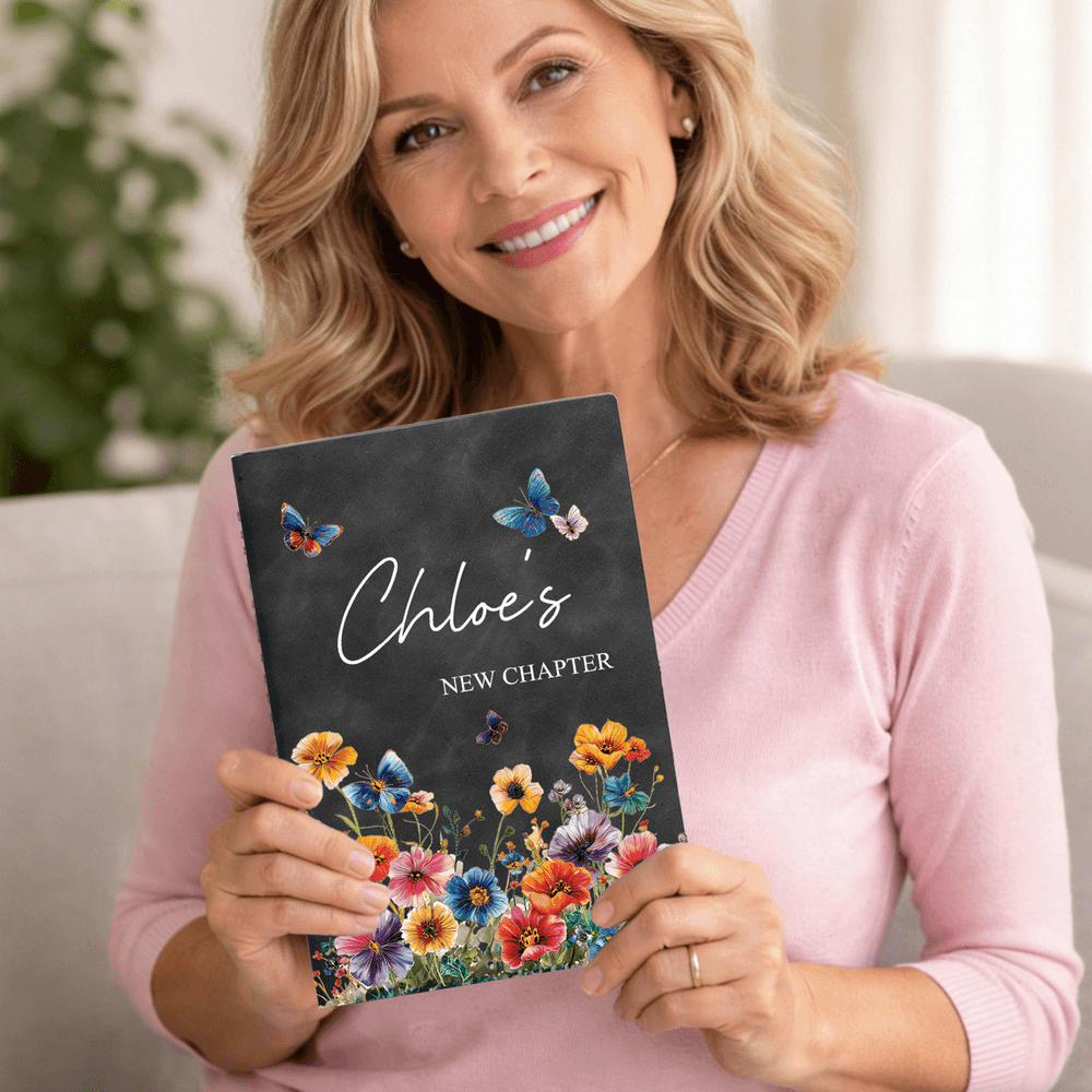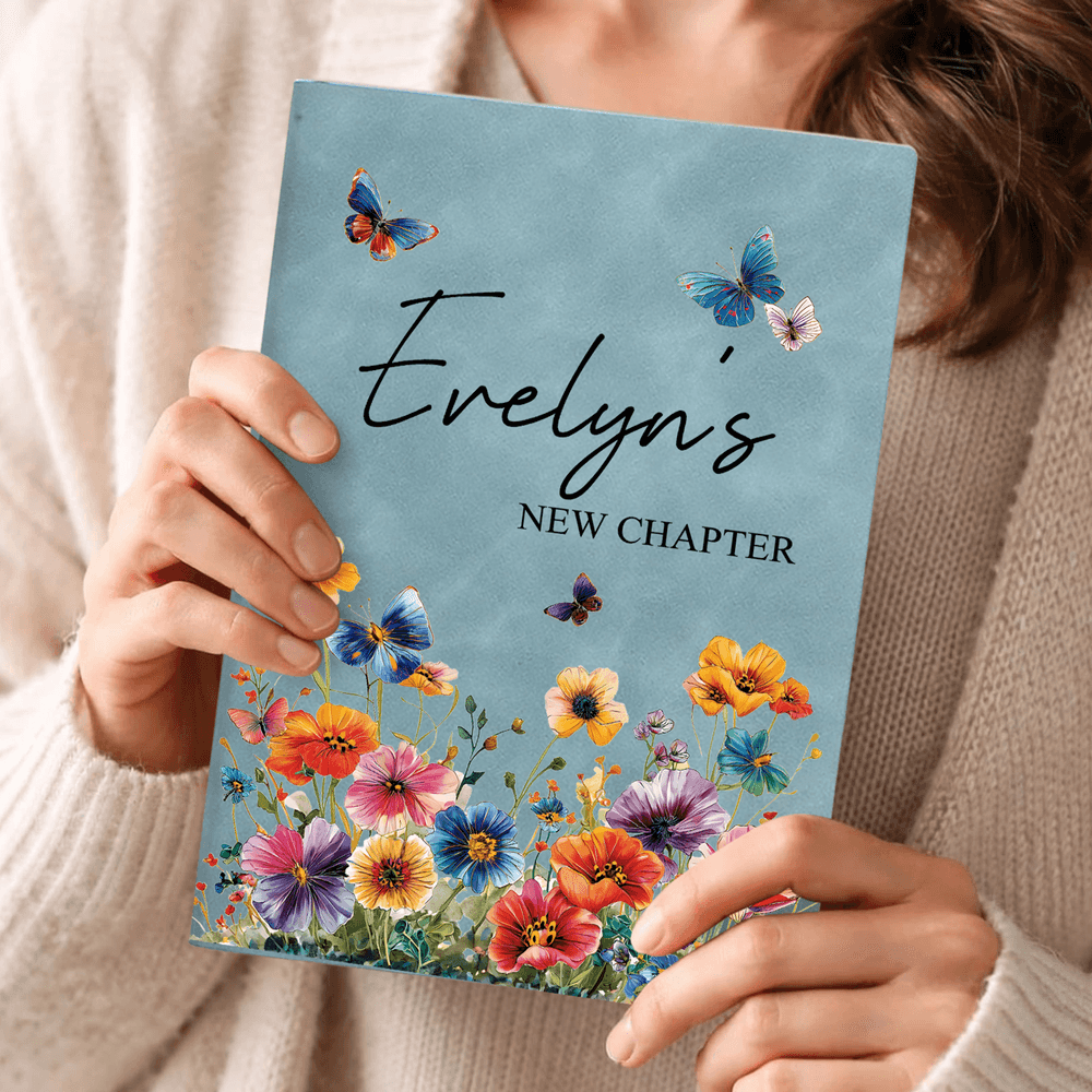 Stampato con il commovente messaggio "NEW CHAPTER" e personalizzabile con il vostro nome. Adornato con fiori e farfalle acquerellate, è fresco ed elegante e trasmette un'atmosfera calma ma vibrante, rendendolo davvero unico.