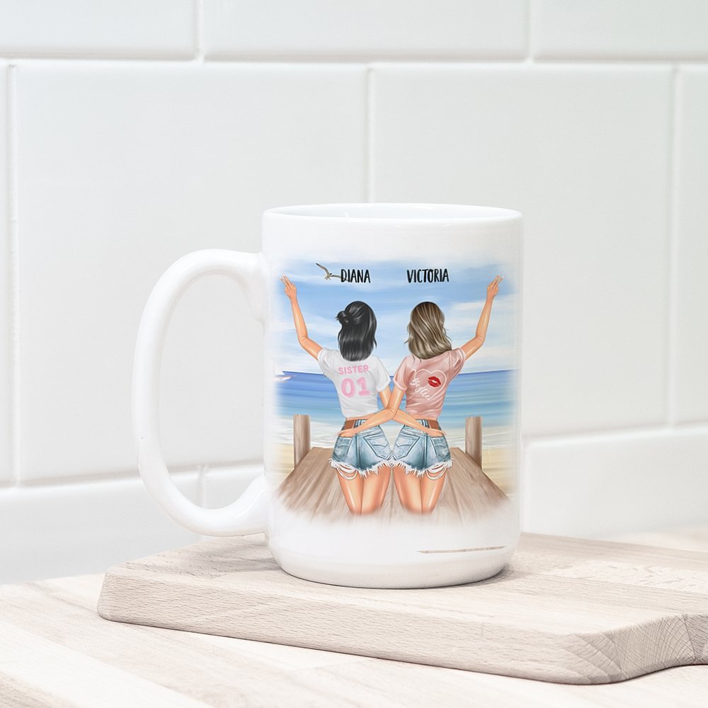 La tazza in ceramica bianca è disegnata con elementi di spiaggia e montagna, e si possono personalizzare le acconciature, i vestiti e i nomi delle due belle ragazze, che simboleggiano l'amicizia tra amiche.