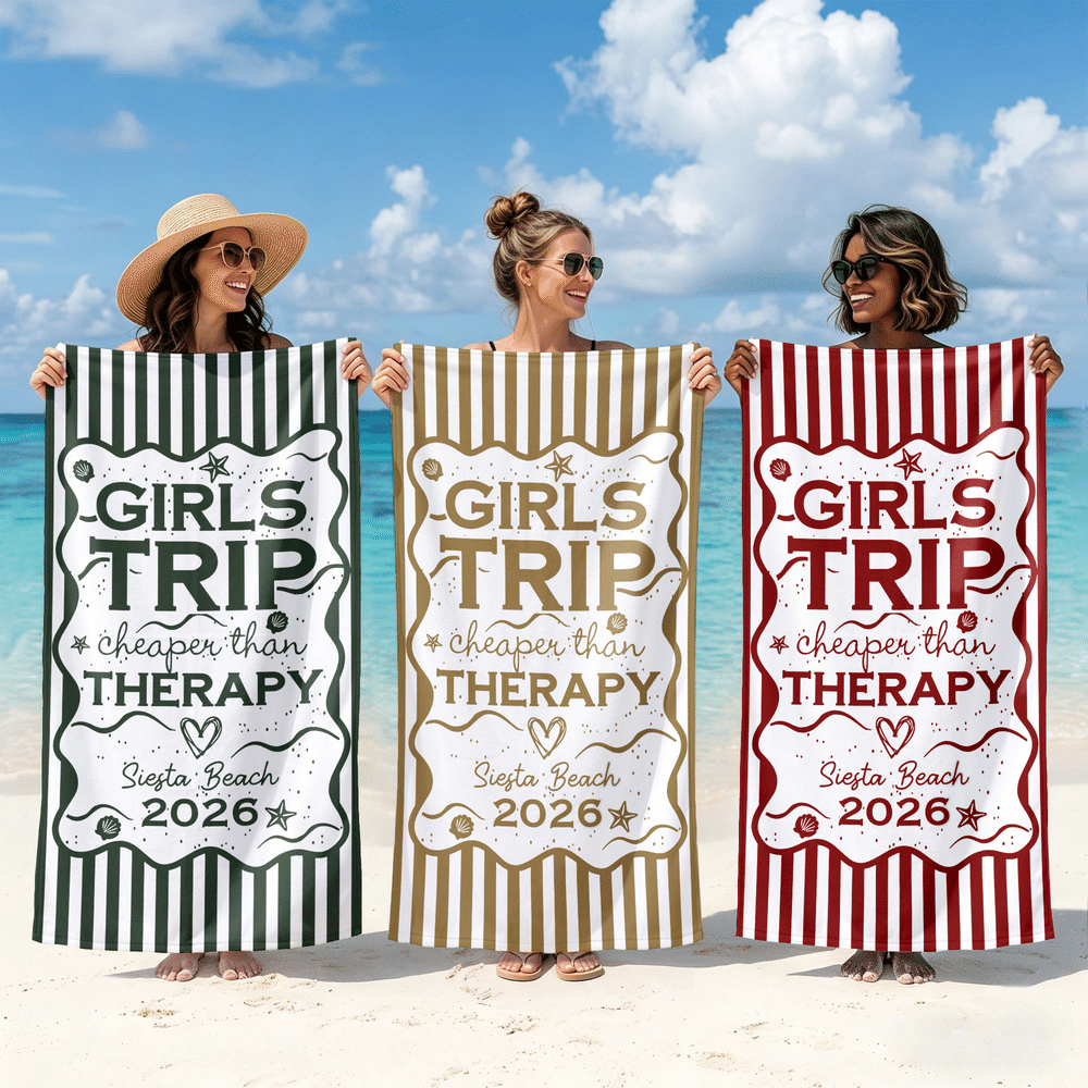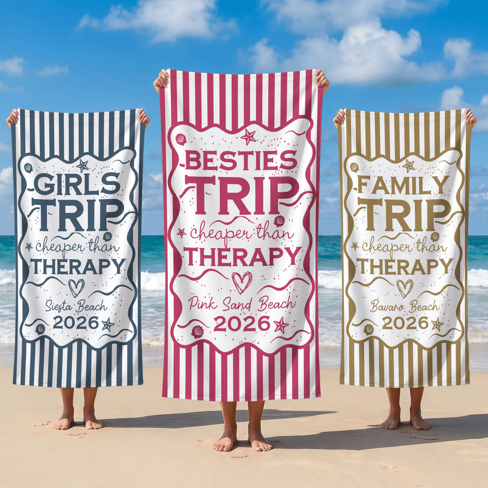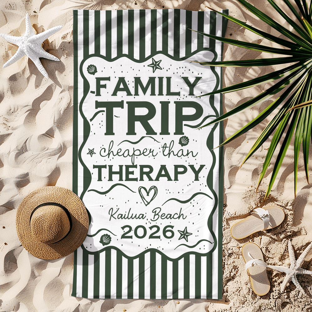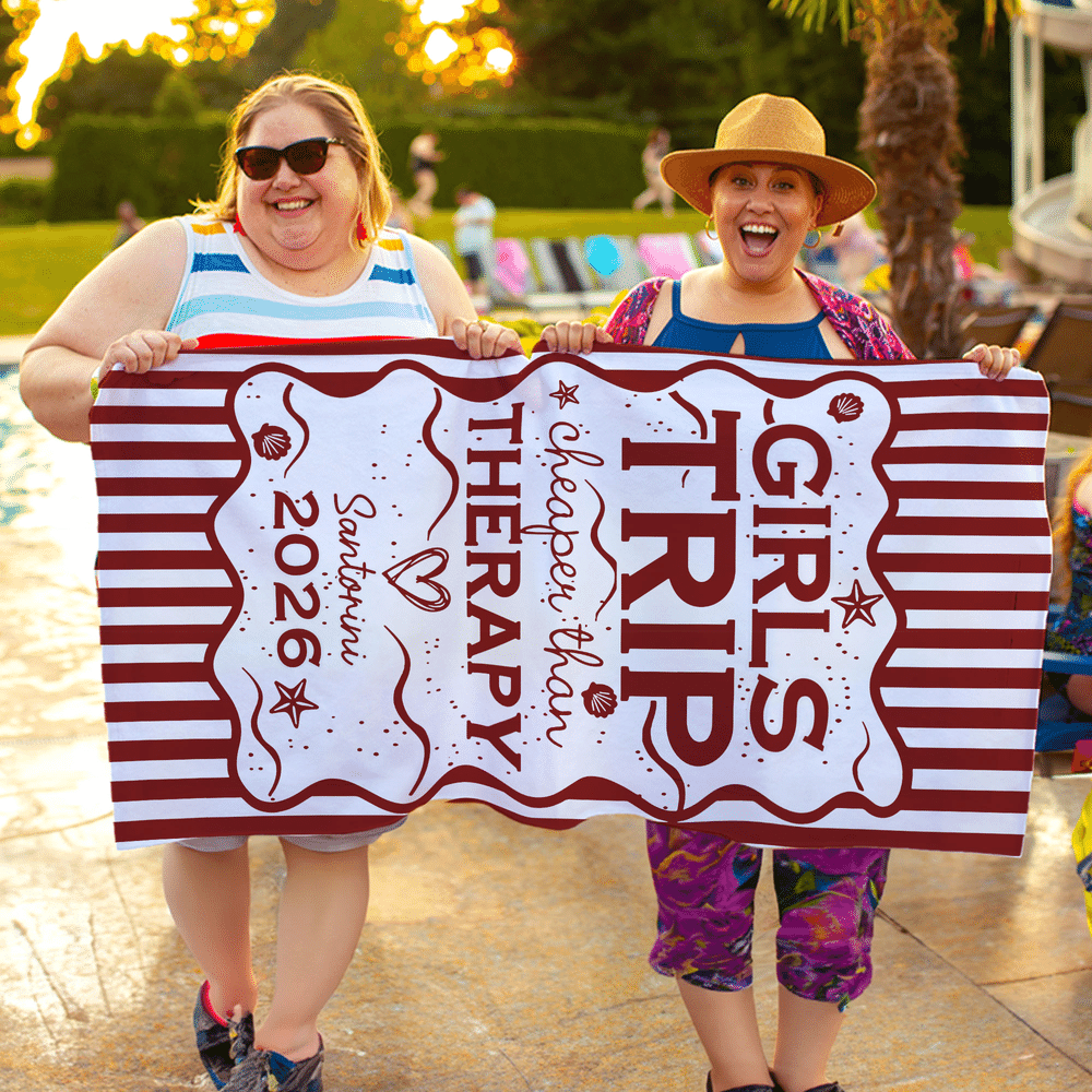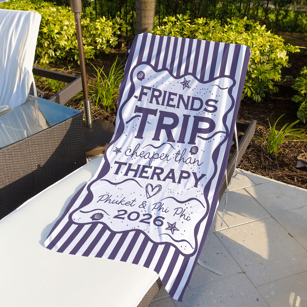 Caratterizzato da uno sfondo a righe fresco e semplice abbinato a elementi classici ispirati all'oceano, questo telo mare evoca un'estetica pulita, estiva e rilassante. Personalizzato con titoli, anno e testo personalizzati, crea un ricordo unico che cattura la bellezza dei viaggi estivi e conserva i ricordi più cari di amicizia e famiglia.