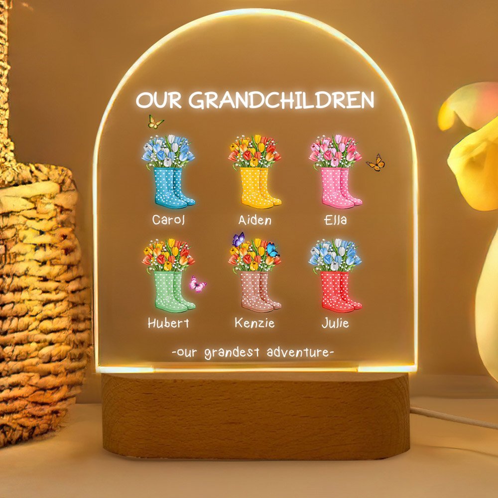 Personalizzato Our Grandest Adventure Stivali floreali 1-6 nomi Luce notturna a LED con testo e base in legno Home Decor Regalo per la festa della mamma nonna
