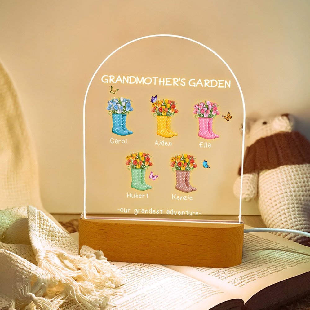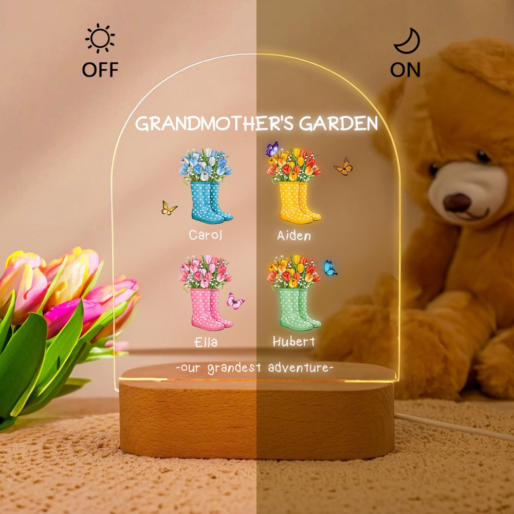 Questa luce notturna è pensata specificamente per le mamme o le nonne e presenta il testo "Our grandest adventure", che aggiunge un tocco di divertimento. Il corpo della lampada presenta un affascinante disegno di stivali da giardino pieni di fiori, con ogni paio che rappresenta un bambino. Farfalle colorate e vivaci circondano gli stivali, simboleggiando la compagnia e la cura dei bambini. È possibile personalizzare 1-6 paia di stivali in base alle proprie esigenze e aggiungere i nomi in basso per dare a questa luce notturna un tocco personalizzato.