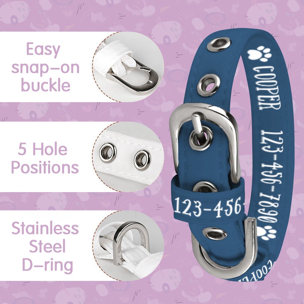 Il collare è realizzato in tessuto oxford di alta qualità e durata per resistere all'usura quotidiana. Progettato per la praticità e il comfort, questo collare è dotato di una facile fibbia a scatto con anello a D per un fissaggio rapido e senza problemi.