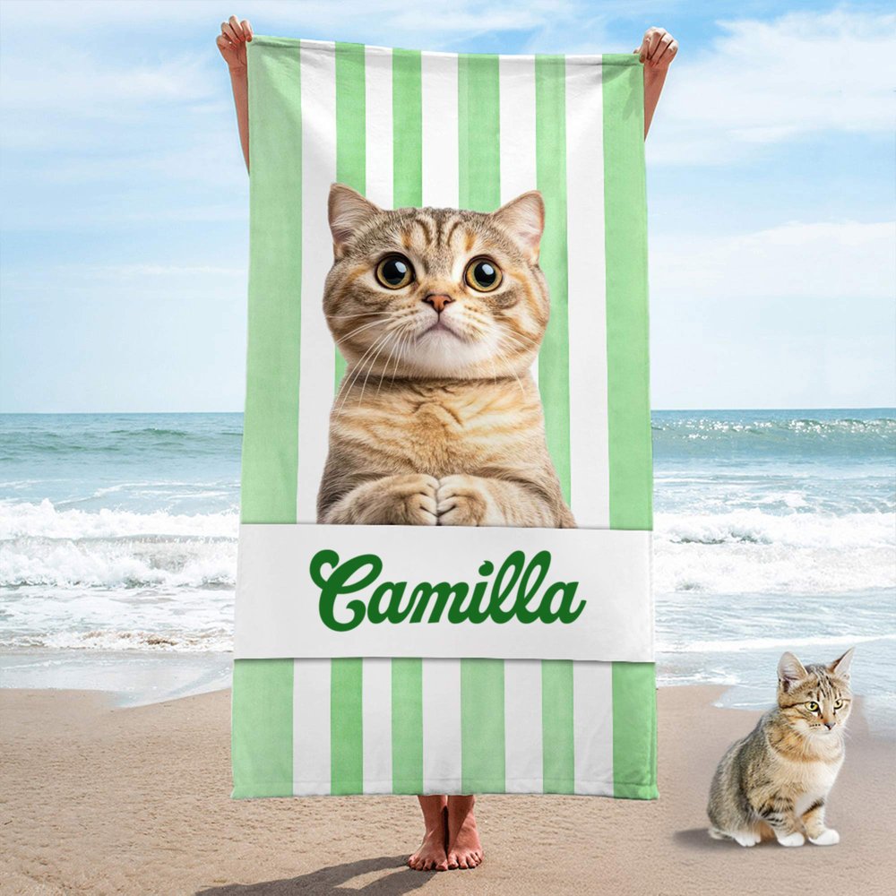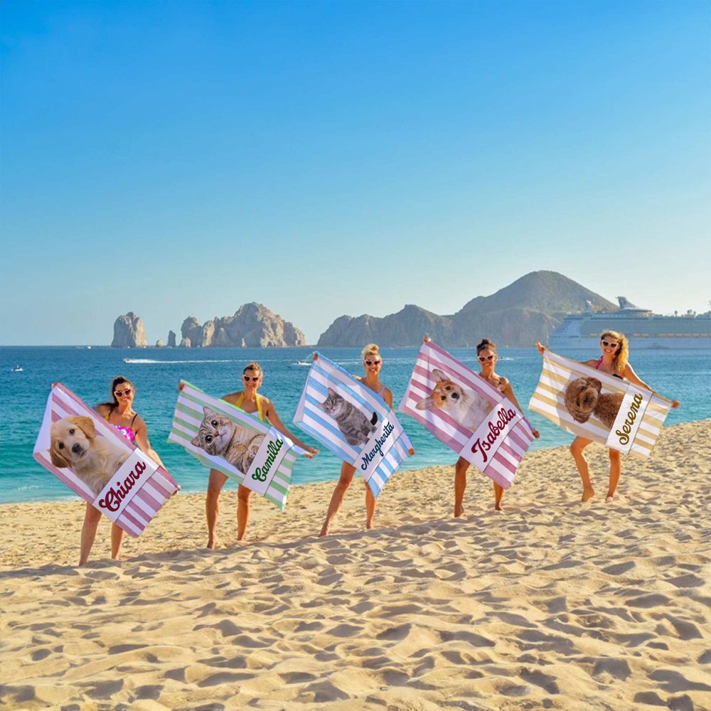 Personalizza il telo con la foto del tuo animale e un nome speciale. Ti basta caricare la tua immagine preferita per trasformarla in un ricordo unico. Questo telo da spiaggia a righe diventerà un accessorio esclusivo, che celebra il legame con il tuo amico peloso. La stampa vivace e resistente allo sbiadimento farà del tuo animale la vera star di ogni giornata al mare.