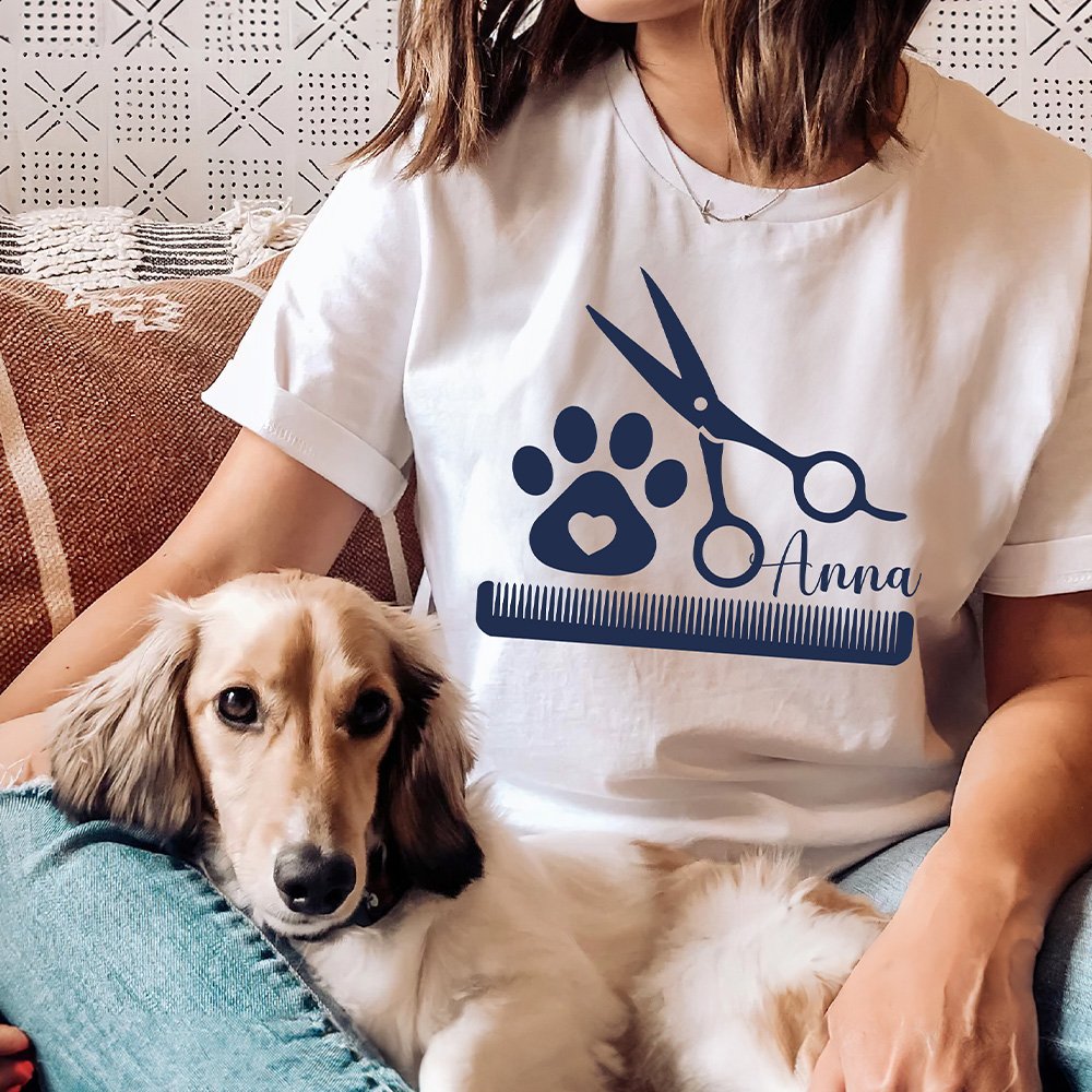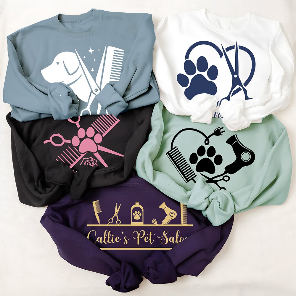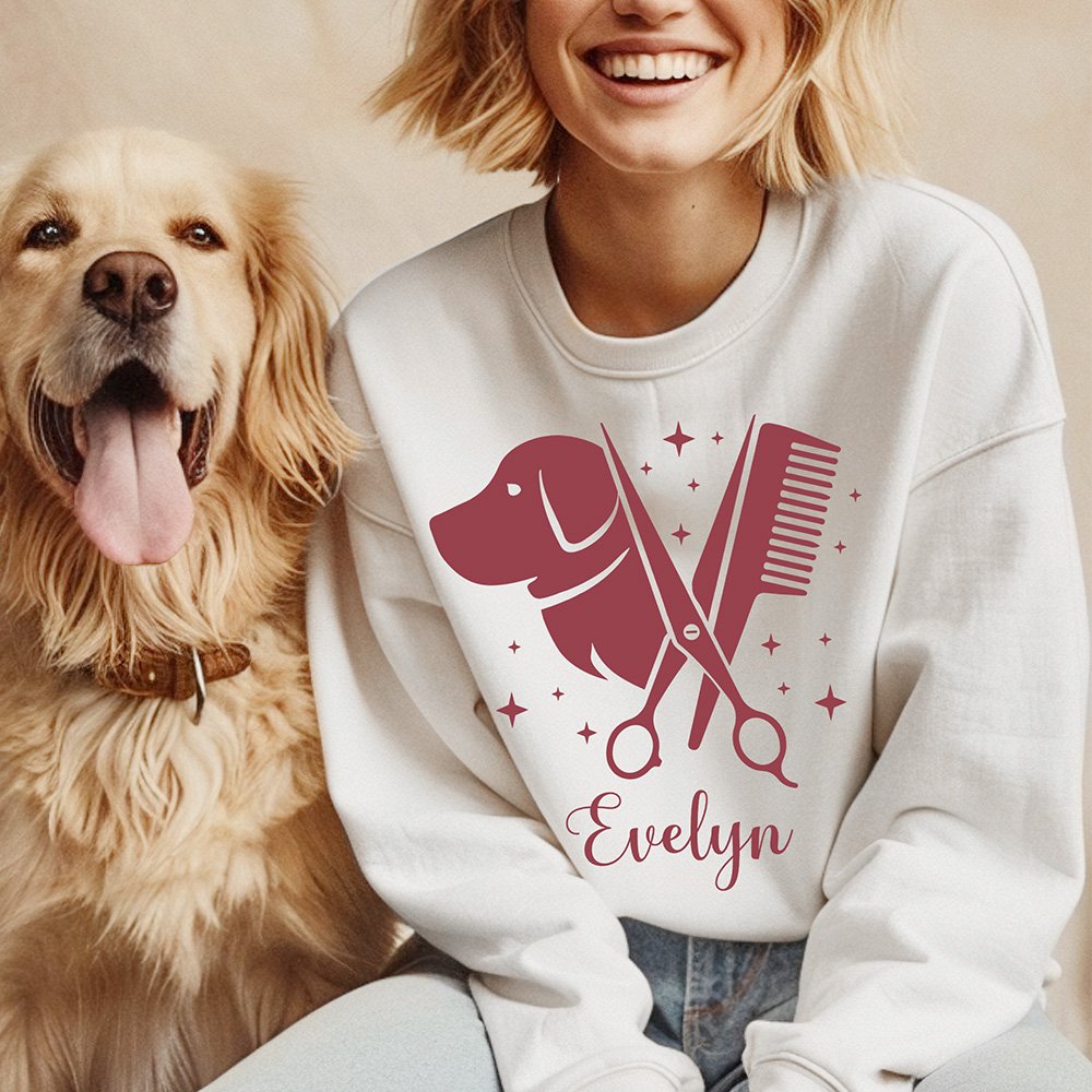 Caratterizzata dal design di un salone per animali domestici, questa felpa e t-shirt celebra l'arte e l'amore per gli animali domestici di parrucchieri e acconciatori. L'aggiunta di un'icona a forma di forbice e di un nome personalizzato rafforza ulteriormente il legame con l'industria dei parrucchieri, consentendo a chi li indossa di mostrare con orgoglio la propria identità e competenza.