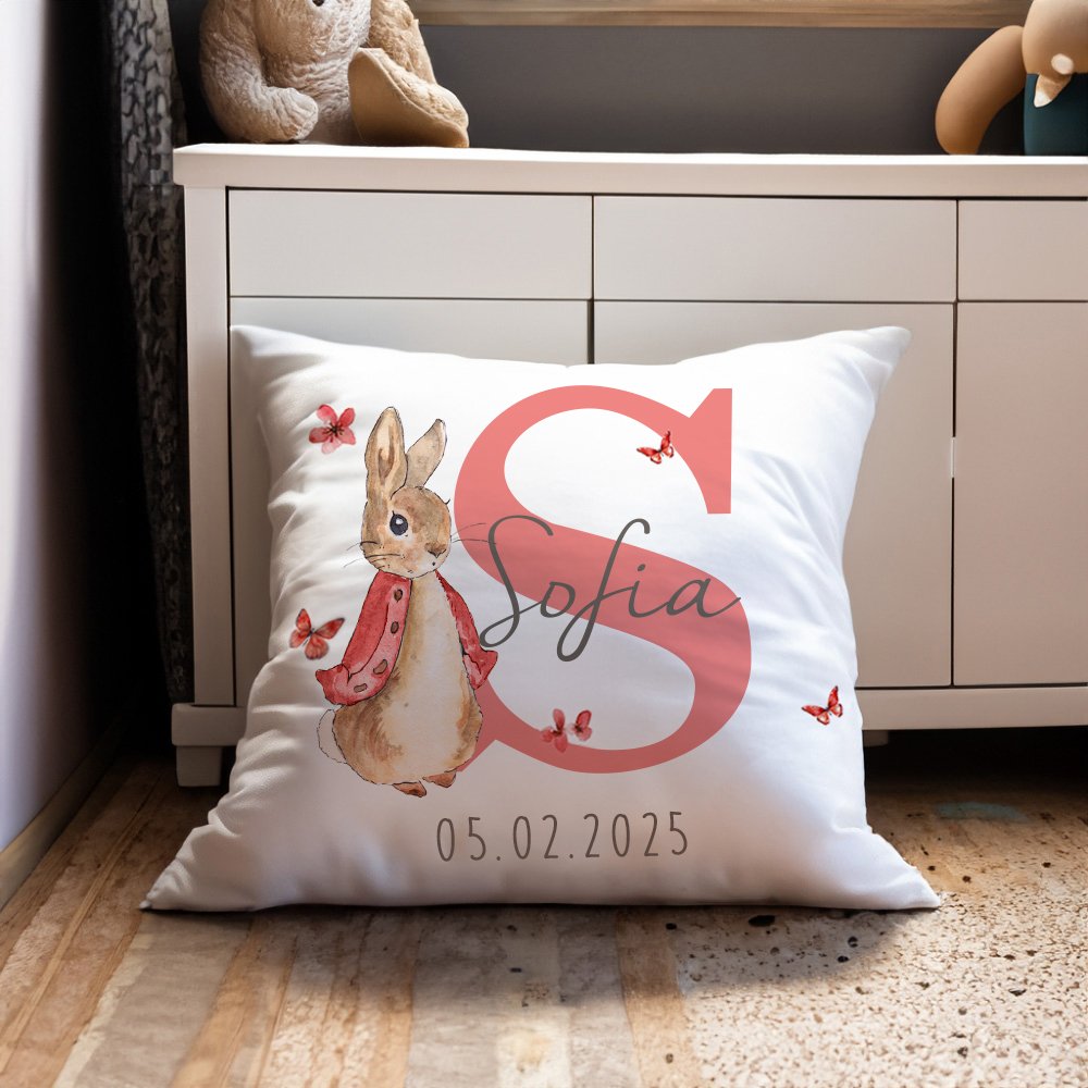 Questa fodera per cuscino, ispirata alla classica immagine di Peter Rabbit, conquisterà il cuore dei bambini! Puoi personalizzarla con un'iniziale, una data e il nome del bambino. Sono disponibili 8 colori di fodera e 3 stili di coniglietto, rendendo ogni cuscino un pezzo unico ed esclusivo, perfetto per accompagnare il tuo bambino nei suoi dolci sogni.