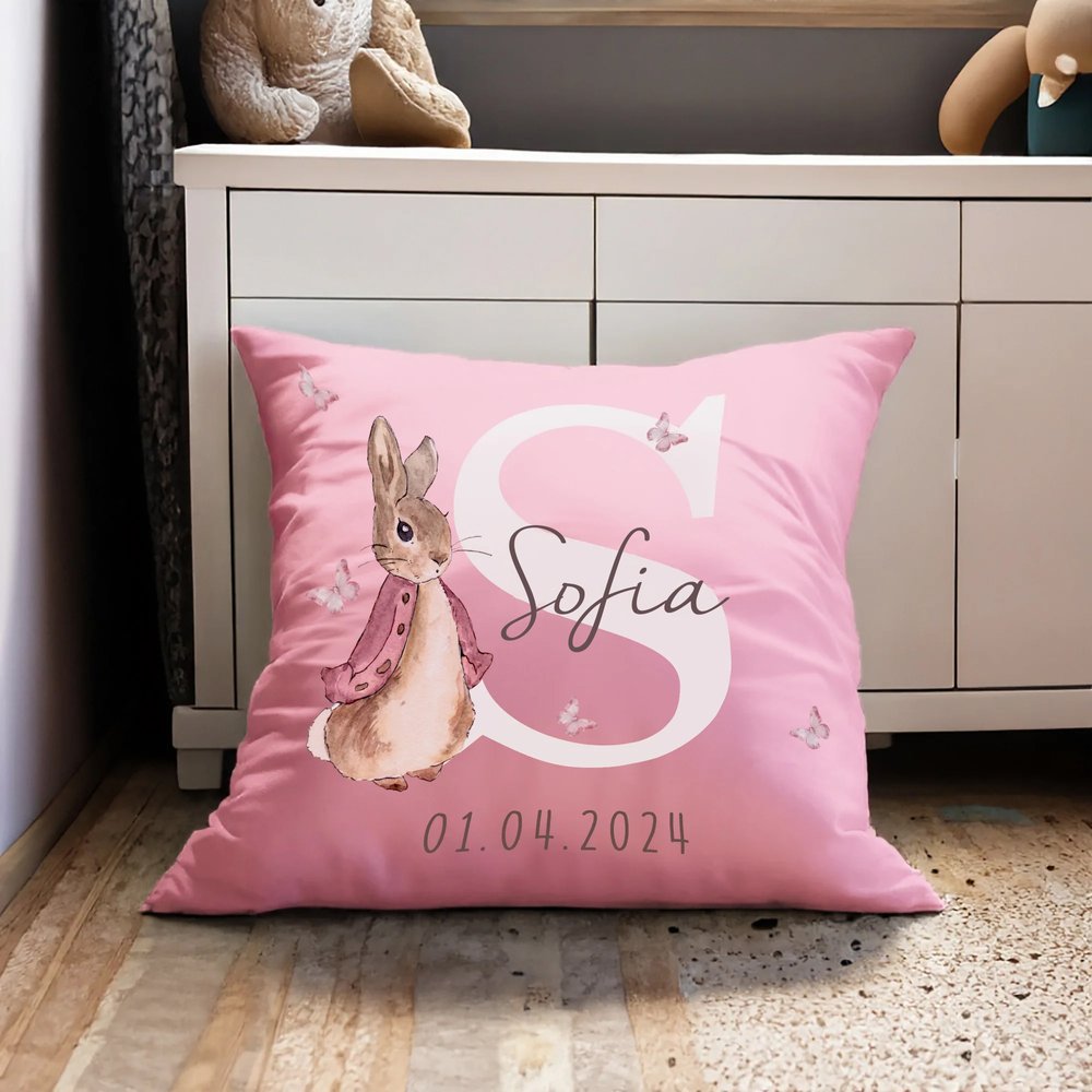 Questa fodera per cuscino, ispirata alla classica immagine di Peter Rabbit, conquisterà il cuore dei bambini! Puoi personalizzarla con un'iniziale, una data e il nome del bambino. Sono disponibili 8 colori di fodera e 3 stili di coniglietto, rendendo ogni cuscino un pezzo unico ed esclusivo, perfetto per accompagnare il tuo bambino nei suoi dolci sogni.