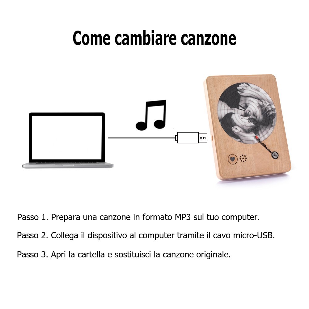 Registra i momenti più belli e le tue benedizioni con questo esclusivo giradischi. Questo regalo "con il suono" ti permette di personalizzare una canzone speciale, unica per te e la tua persona. Dopo averlo ricevuto, basta premere il pulsante di riproduzione per riascoltare il brano che vi lega. Un modo perfetto per custodire ricordi indelebili.