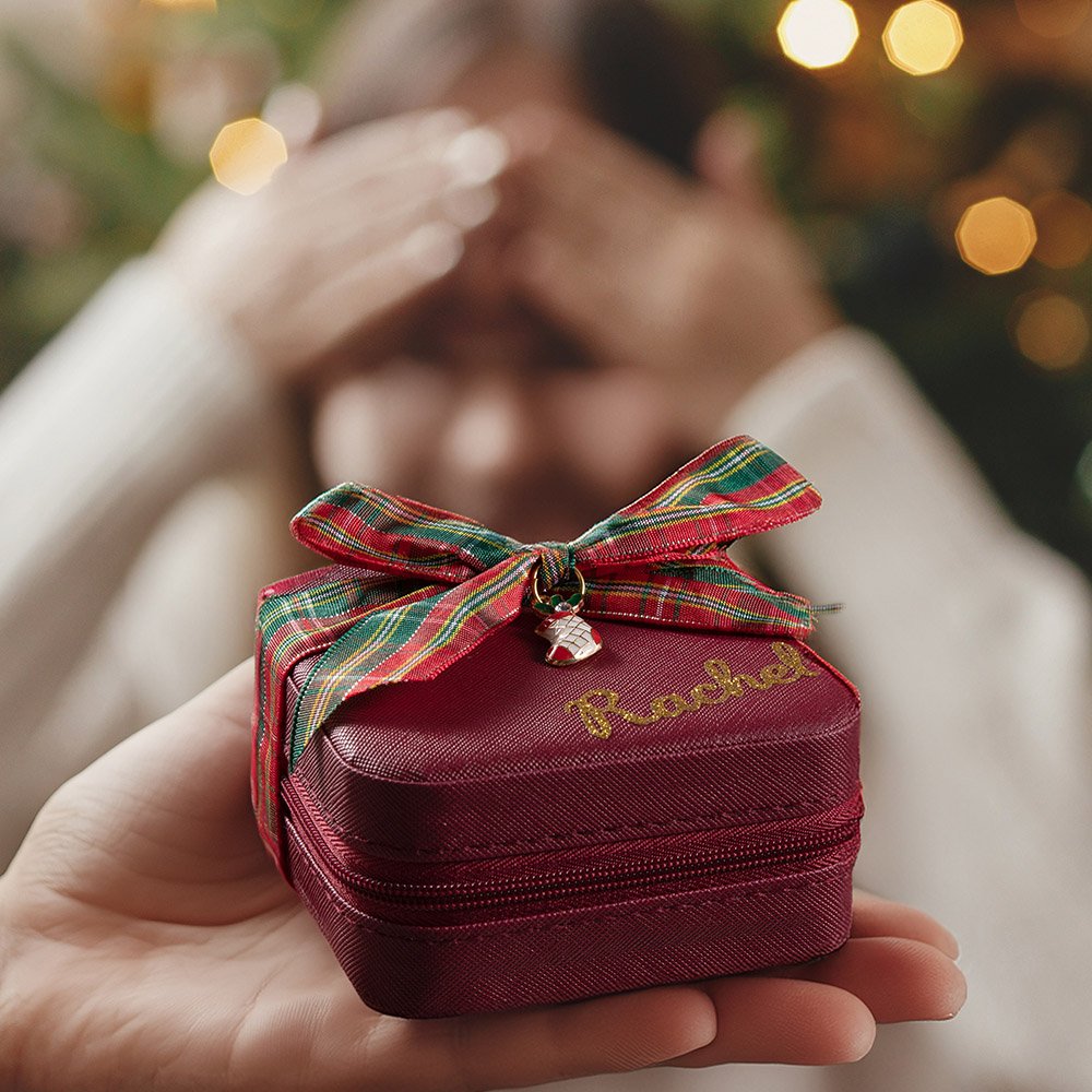 Il portagioie è disponibile in due colori classici, rosso e nero, ed è decorato con un fiocco a quadri, che aggiunge un'atmosfera festosa. Il portagioie è dotato anche di accessori natalizi, come calze di Natale, renne e così via. Il portagioie può anche essere stampato con un nome per renderlo più personale.