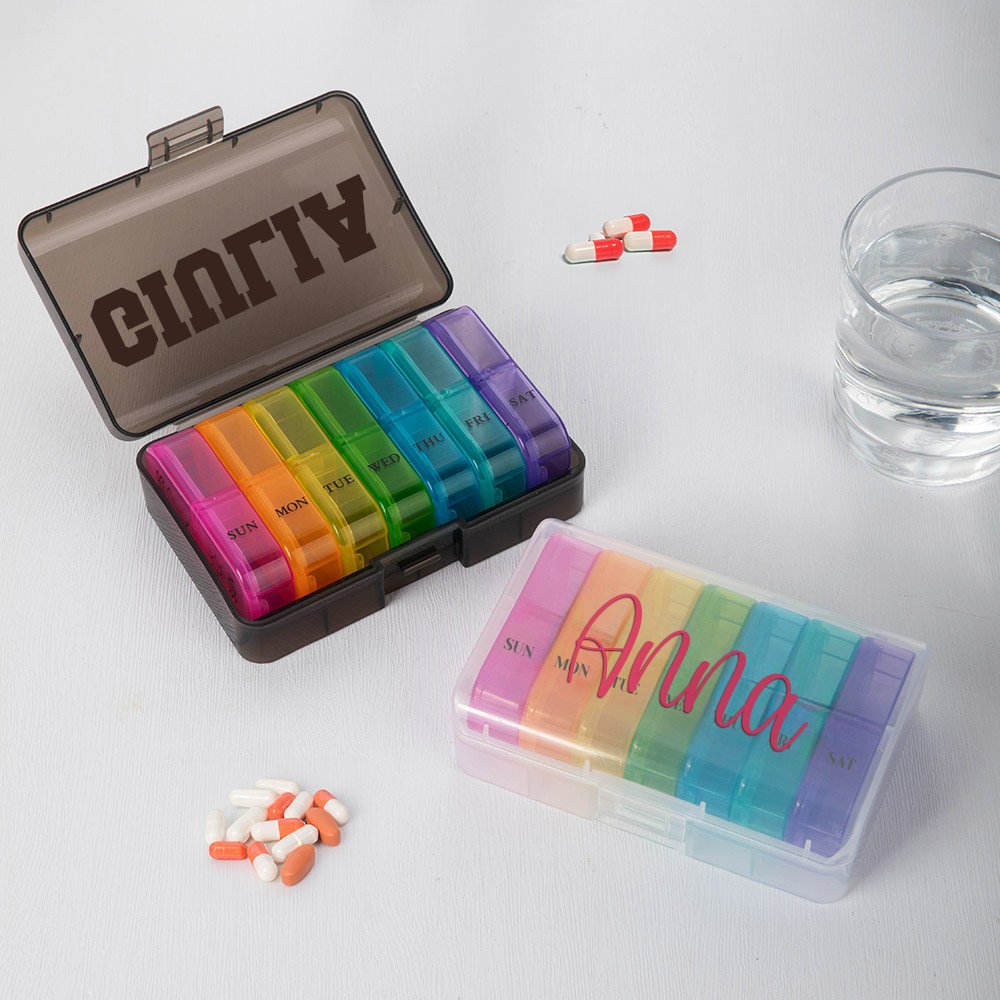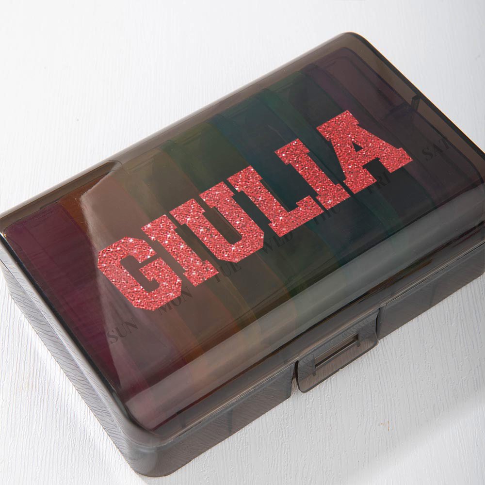 Questo portapillole sfoggia un design arcobaleno con un nome personalizzabile, aggiungendo un tocco semplice e vivace. Con promemoria giornalieri (da lunedì a domenica) e icone per mattina e sera, rende la gestione dei farmaci più efficiente. Offriamo 2 colori della scatola (trasparente e nero) e 28 colori per il carattere, così puoi scegliere la combinazione che preferisci. Con 6 stili di font diversi, troverai quello che rispecchia appieno il tuo stile.