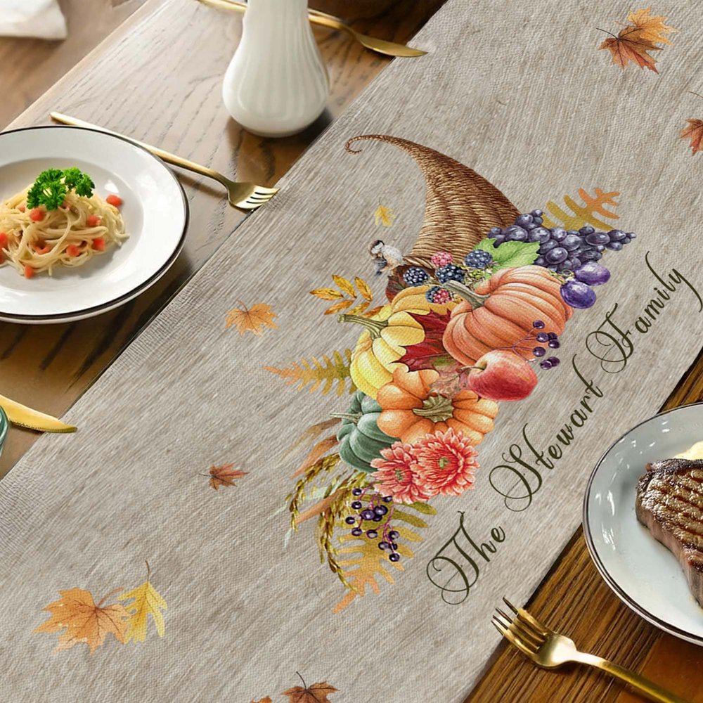 Questo runner da tavola presenta al centro una ricca cornucopia, circondata da vivaci zucche, uva e mele rosse, oltre che da vivaci uccelli e felci. Le foglie autunnali sparse aggiungono un ritmo naturale. Il testo personalizzabile trasforma questa scena autunnale in un ricordo di famiglia che scalda il cuore, con ogni dettaglio che riflette l'abbondanza della stagione e il calore della casa.