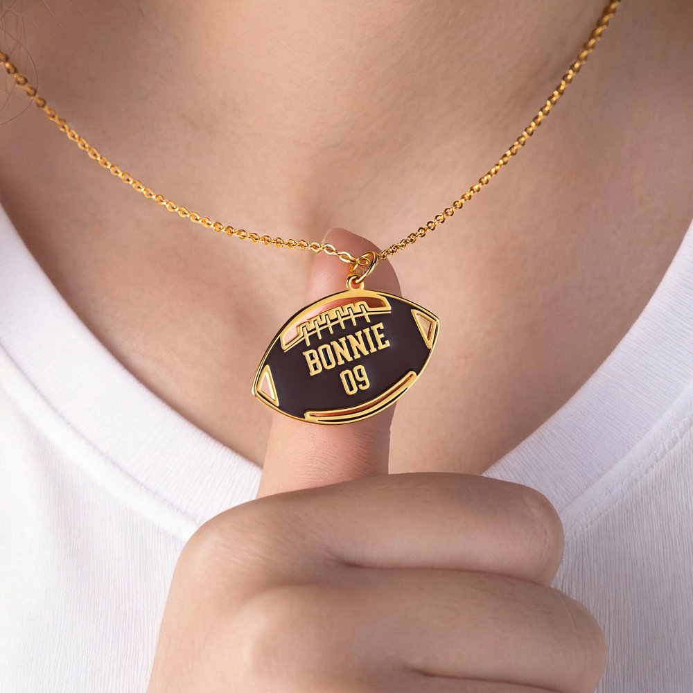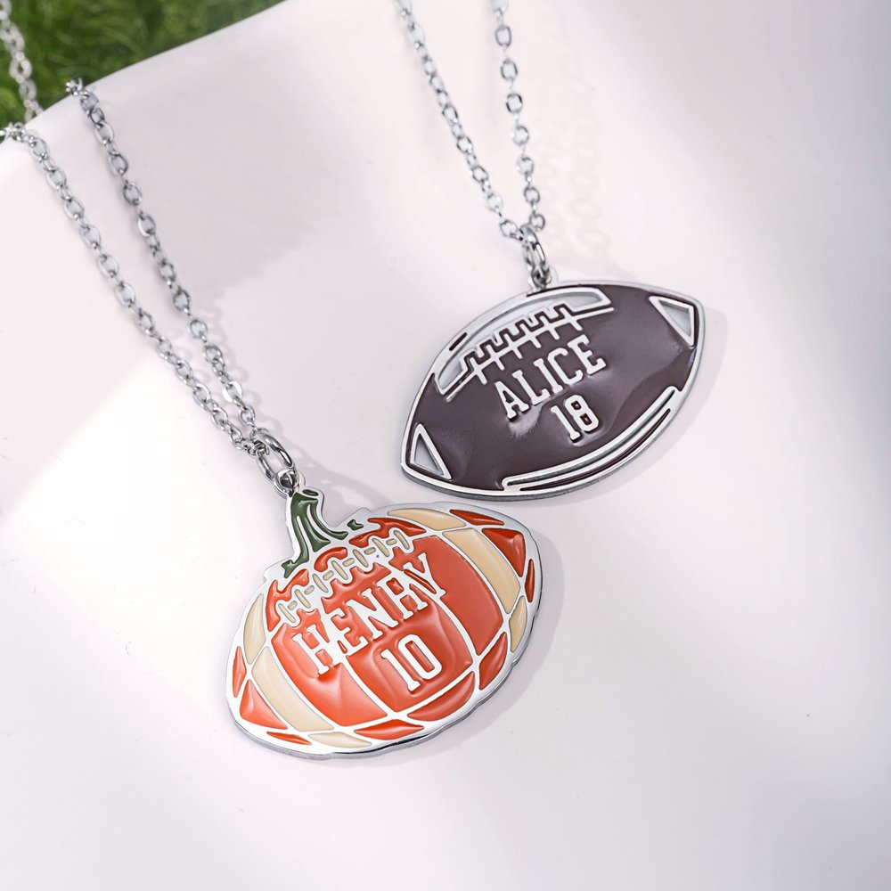 Questo caratteristico ciondolo fonde in modo creativo elementi del football con la forma di una zucca, dando vita a un accessorio davvero unico. Personalizzabile con nome e numero, collega in modo artistico la passione per il gioco con lo spirito del Ringraziamento. Ogni collana diventa un pezzo unico, che mostra una fusione personalizzata di orgoglio sportivo e stile festivo.
