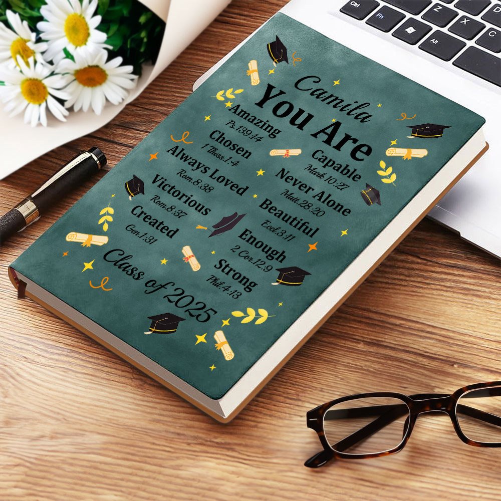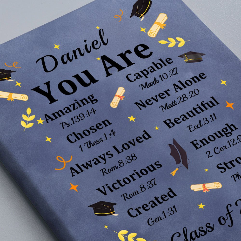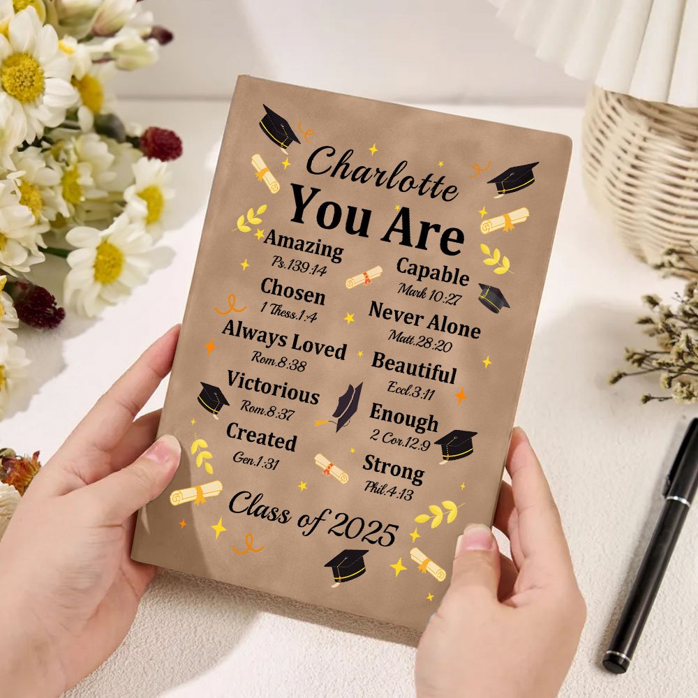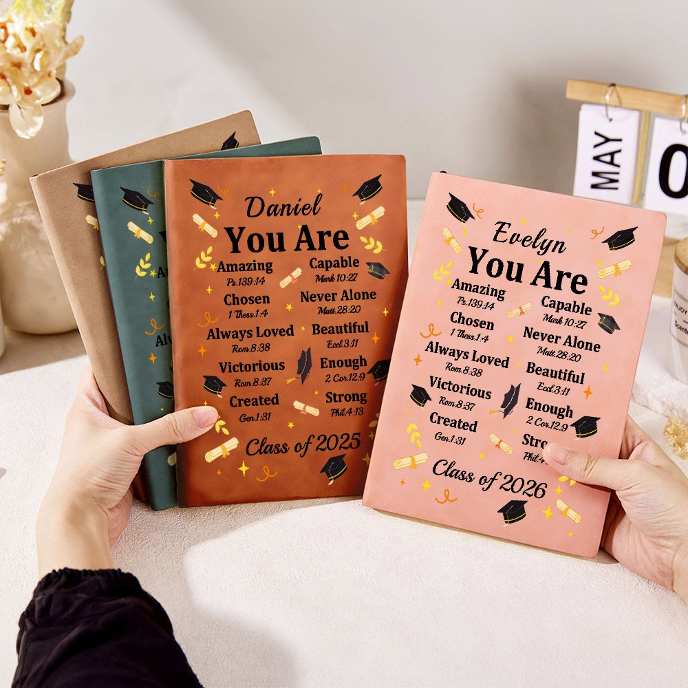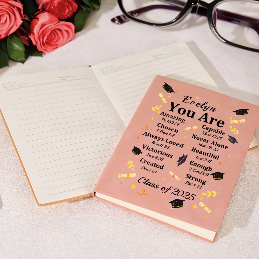Questo quaderno presenta il nome di un capitolo della Bibbia e un elemento di laurea. Può essere personalizzato con il nome e l'anno di laurea, il che non solo lo rende unico, ma lo rende anche un mezzo perfetto per registrare la fede, la crescita o le esperienze personali.