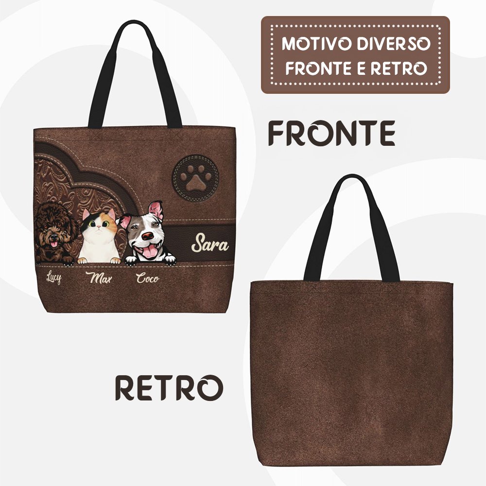 Questa borsa da spesa disponibile in 8 colori può essere personalizzata con 1-6 disegni di cani o gatti. Aggiungi i nomi dei tuoi animali e per esprimere il tuo amore verso di loro e portarli sempre con te.
