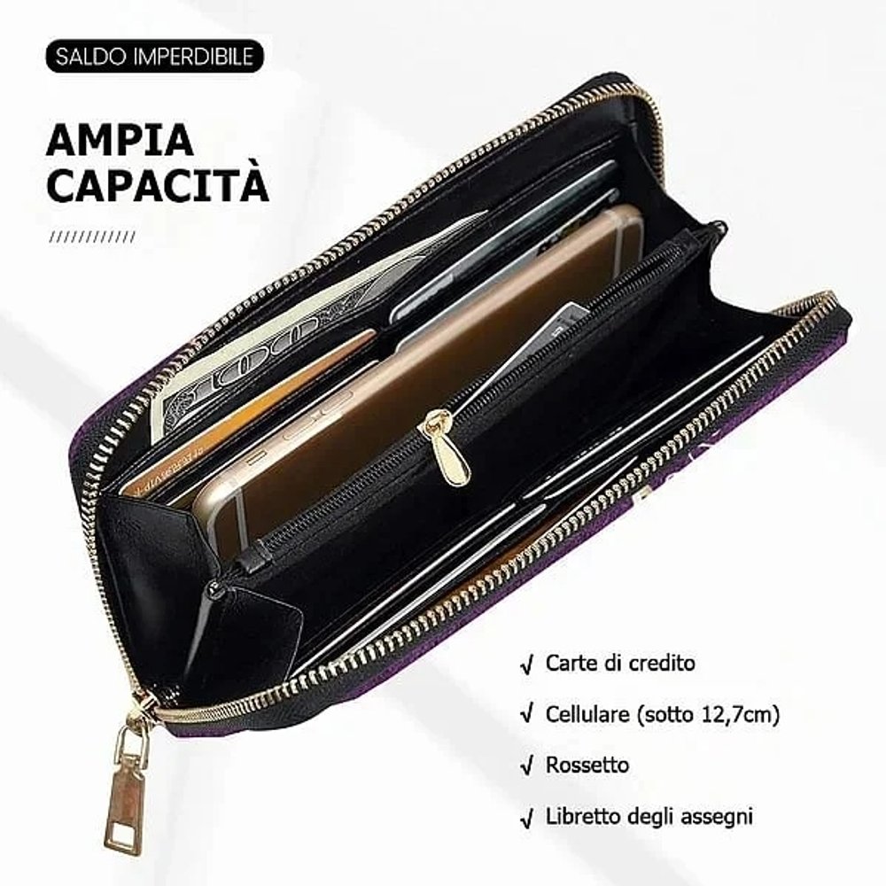 Dotato di molte tasche per carte, un ampio scomparto per banconote e una grande tasca con zip, mantiene tutto organizzato e protetto. La chiusura a zip assicura che carte, contanti, ricevute e persino il telefono siano al sicuro, offrendo praticità e tranquillità.
