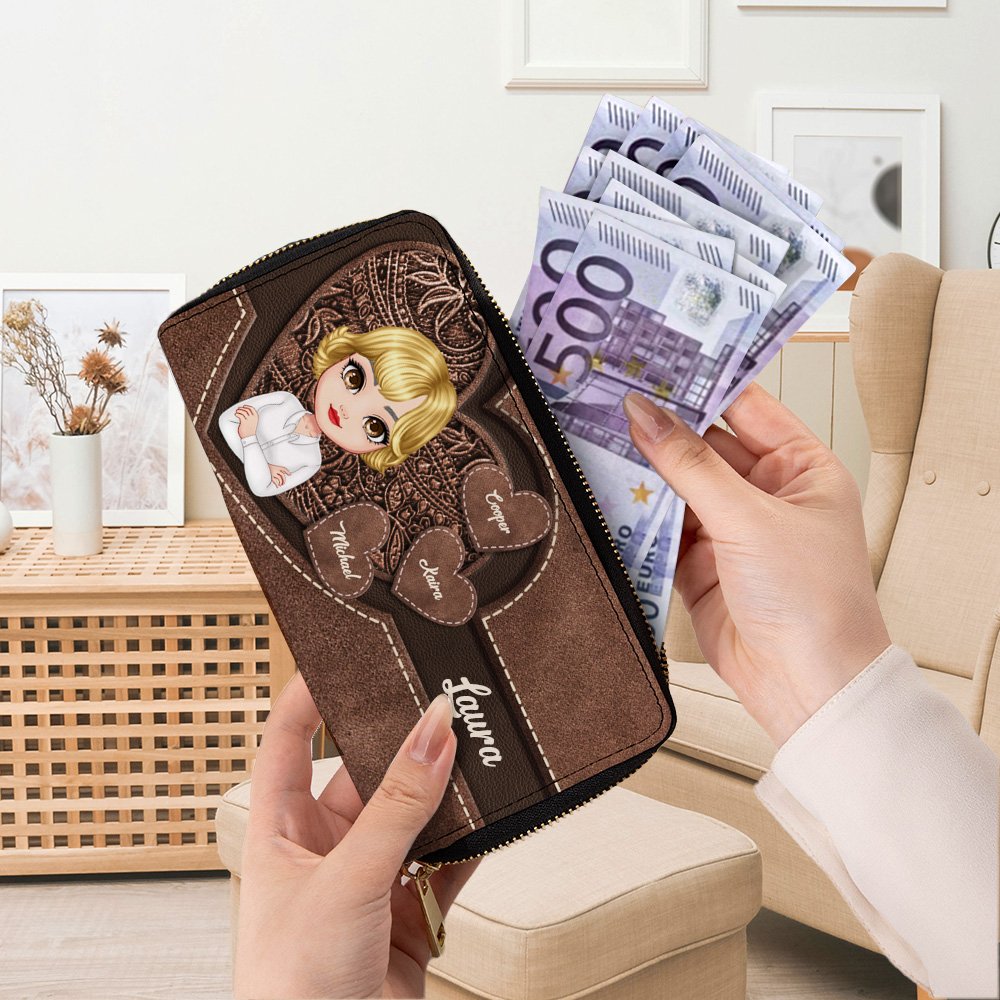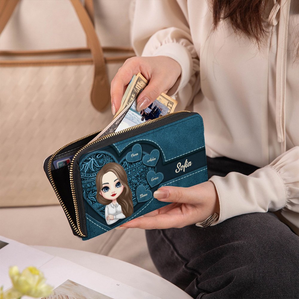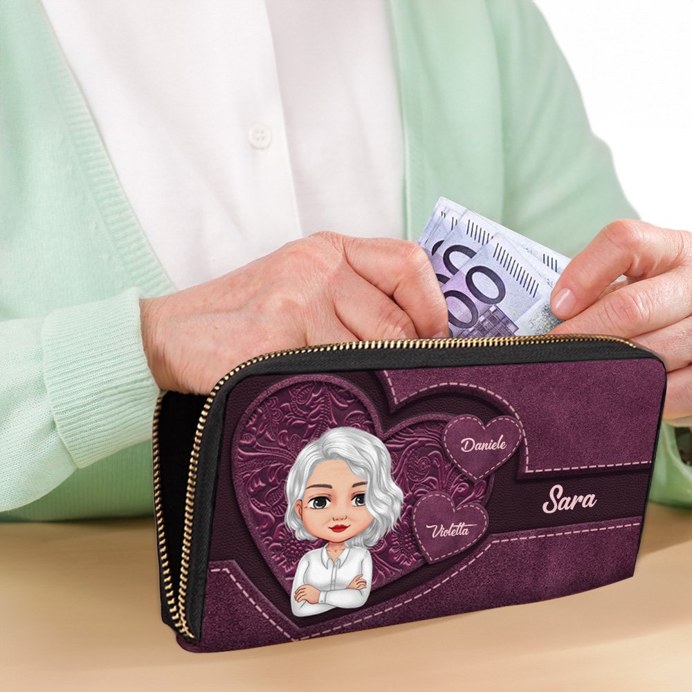 Questo portafoglio retrò per donna può essere personalizzato con i nomi della madre e di 1-8 membri della famiglia. Con motivi a litchi e numerosi dettagli a cuore, il design unisce stile vintage ed eleganza moderna. Disponibile in 8 colori.