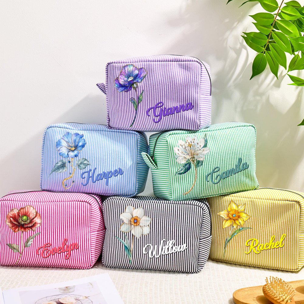 La nostra borsa per cosmetici presenta una colorazione a righe classica e versatile ed è impreziosita da un motivo artistico in stile pittura a olio. L'elegante fiore di compleanno è rifinito in oro e decorato con pietre preziose per un tocco vintage. Personalizzatela con il vostro nome per ottenere un pezzo unico che rifletta la vostra personalità.