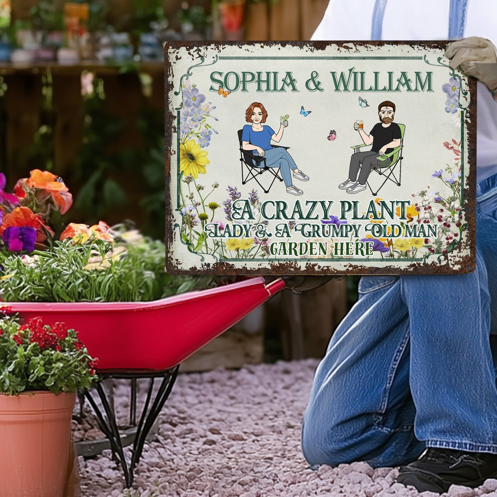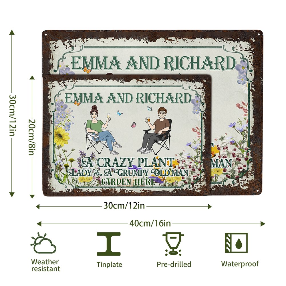 Questa targa in metallo presenta due personaggi dei cartoni animati seduti su una sedia pieghevole con un'espressione rilassata, circondati da fiori in fiore e farfalle svolazzanti. Sulla parte inferiore della targhetta sono presenti anche le scritte "A Crazy Plant Lady & a Grumpy Old Man" e "Garden Here", che trasmettono l'atmosfera della vita. Inoltre, supporta nomi personalizzati e forme di cartoni animati, rendendo ogni segno davvero unico.