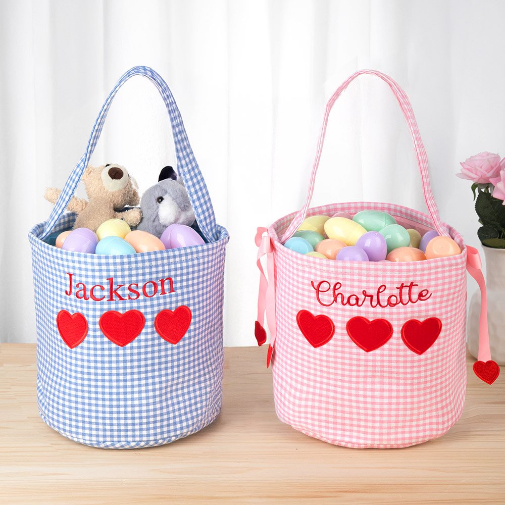 Il design è pieno di divertimento infantile e questa borsa a secchiello presenta un motivo a scacchi rossi o blu e tre toppe a cuore ricamate. Inoltre, la borsa a secchiello rosa è ornata da due nastri su entrambi i lati, che creano un'atmosfera calda e innocente. È possibile personalizzare il proprio nome sulla superficie per mostrare il proprio stile. Ogni borsa a secchiello è accompagnata da un biglietto a forma di cuore a scacchi che può essere personalizzato con il vostro nome.