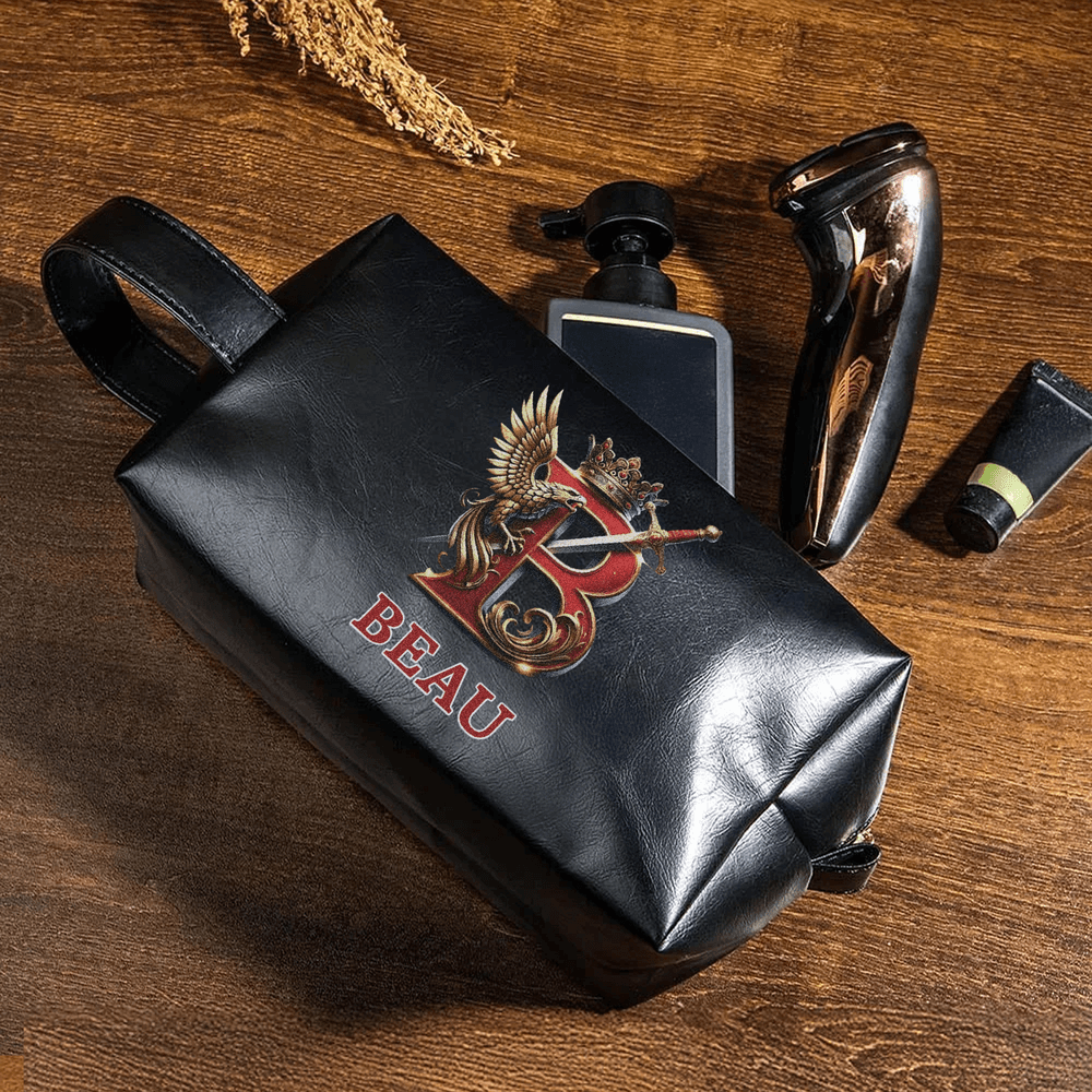 Questa borsa da toilette da uomo presenta un accattivante design iniziale, personalizzato con l'iniziale e il nome di vostra scelta. Ispirato a uno stemma araldico in stile reale (con corona, ali e dettagli di spada), aggiunge un tocco raffinato e maschile, perfetto per chi ama accessori eleganti e distintivi.