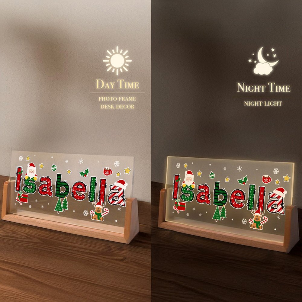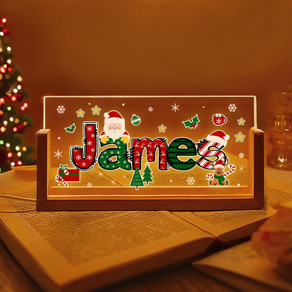 Adornata da Babbo Natale e da un alce, questa luce notturna può essere personalizzata con nomi a tema natalizio per creare un ambiente festoso e caratteristico.