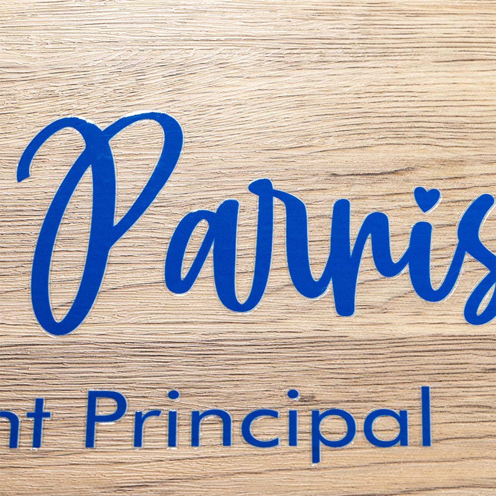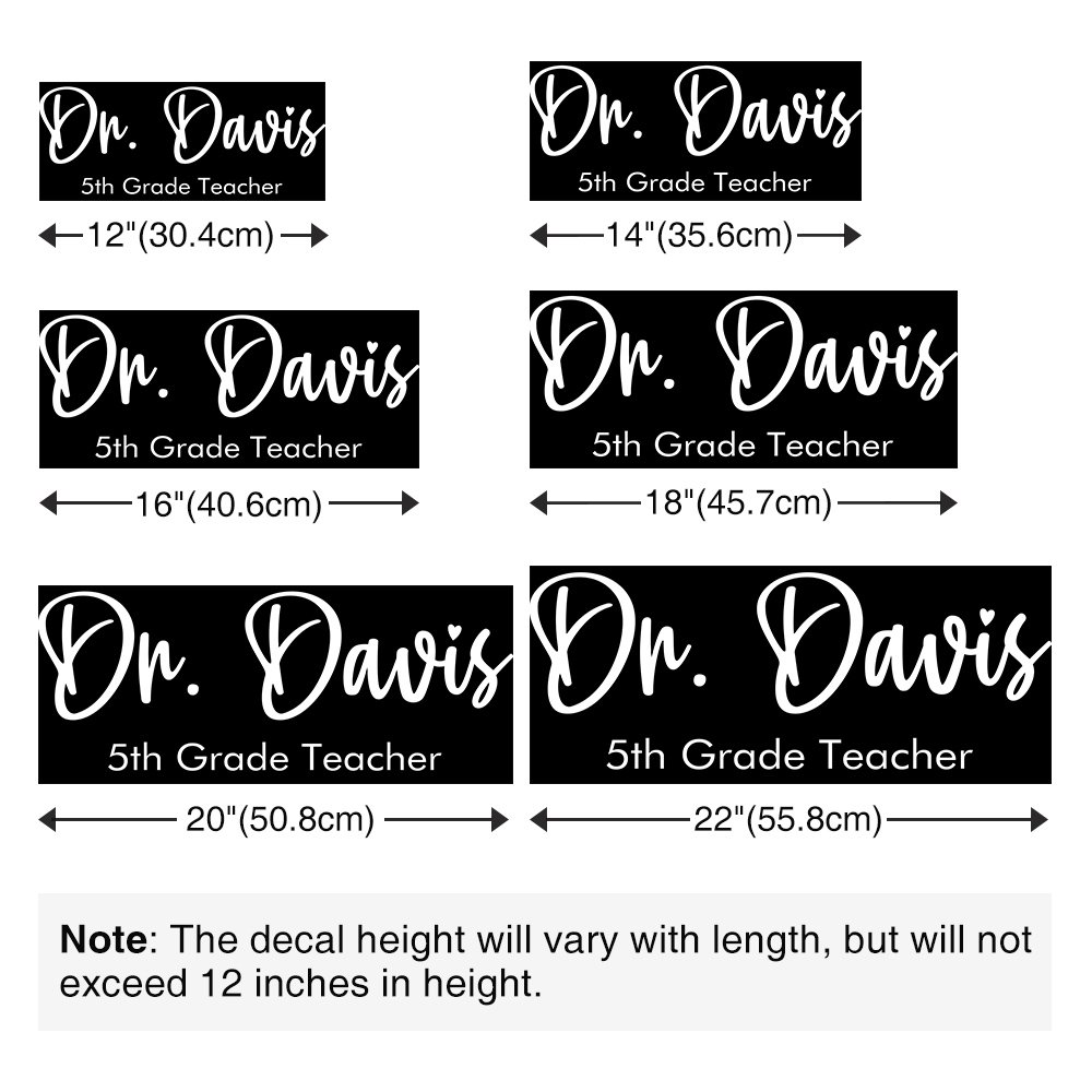 1. Questa decalcomania può essere posizionata in verticale come foto o in orizzontale come preferite. 2. Si consiglia di misurare lo spazio per decidere le dimensioni corrette. La dimensione media di una porta di un'aula scolastica è di 36 pollici di larghezza, ma i tavoli possono variare in termini di dimensioni e posizionamento, quindi non ci piace consigliare la dimensione migliore per voi. 3. Le dimensioni indicate si riferiscono alla larghezza della decalcomania. L'altezza varia in base al numero di lettere del nome, ma sarà sempre proporzionale e non supererà i 12 pollici. I nomi più corti (es.: Ms. Ava) saranno più alti, mentre quelli più lunghi (es.: Mrs. Heathcliff) saranno più corti. 4. I colori possono variare a seconda delle impostazioni del monitor utilizzato.