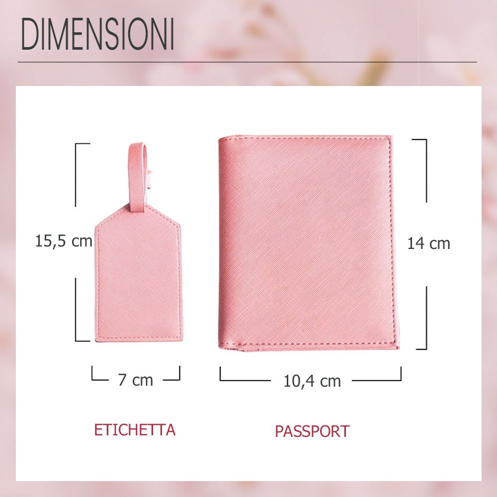 | Dimensione: | Portapassaporto - 10,4 x 14 cm; Etichetta per bagagli - 7 x 15,5 cm |