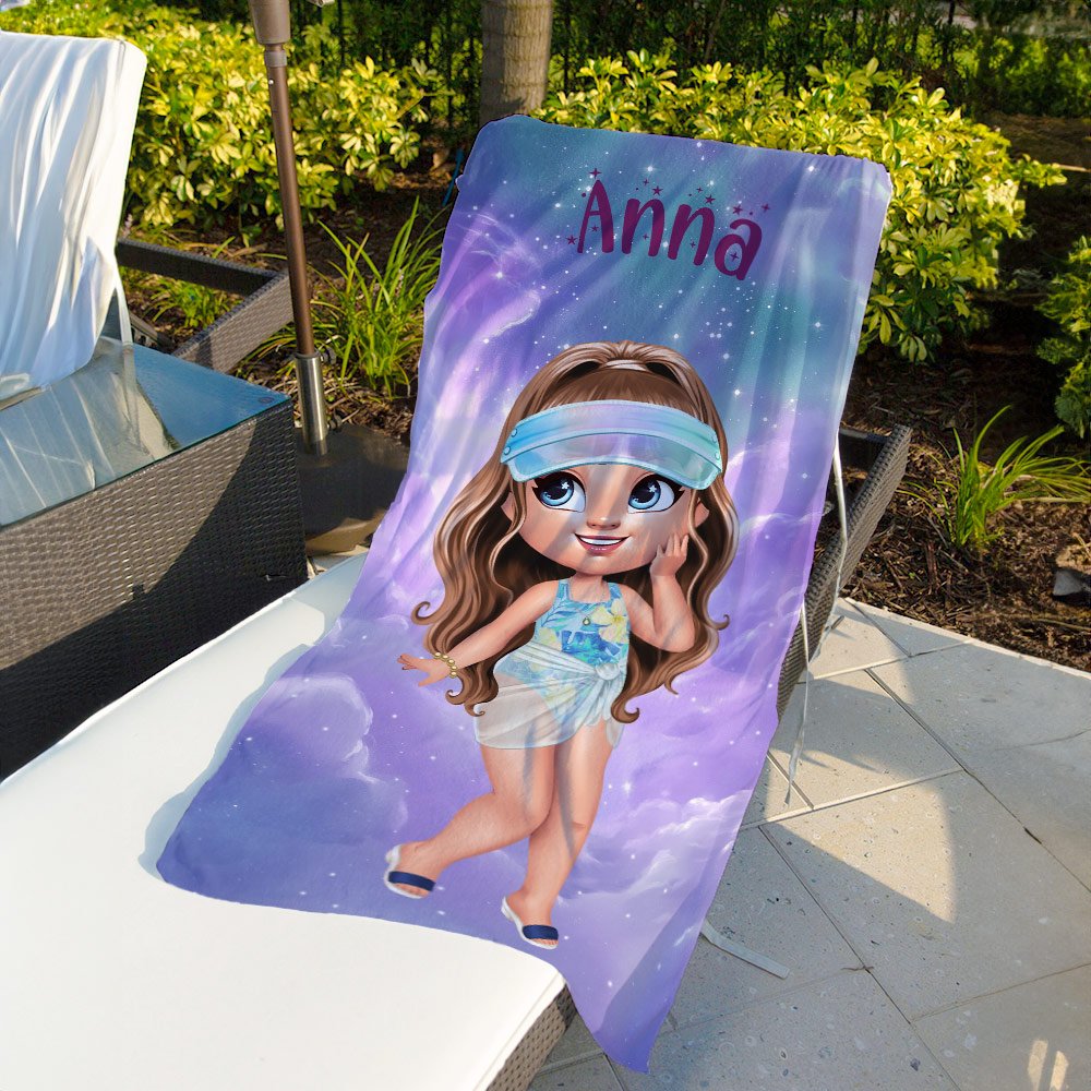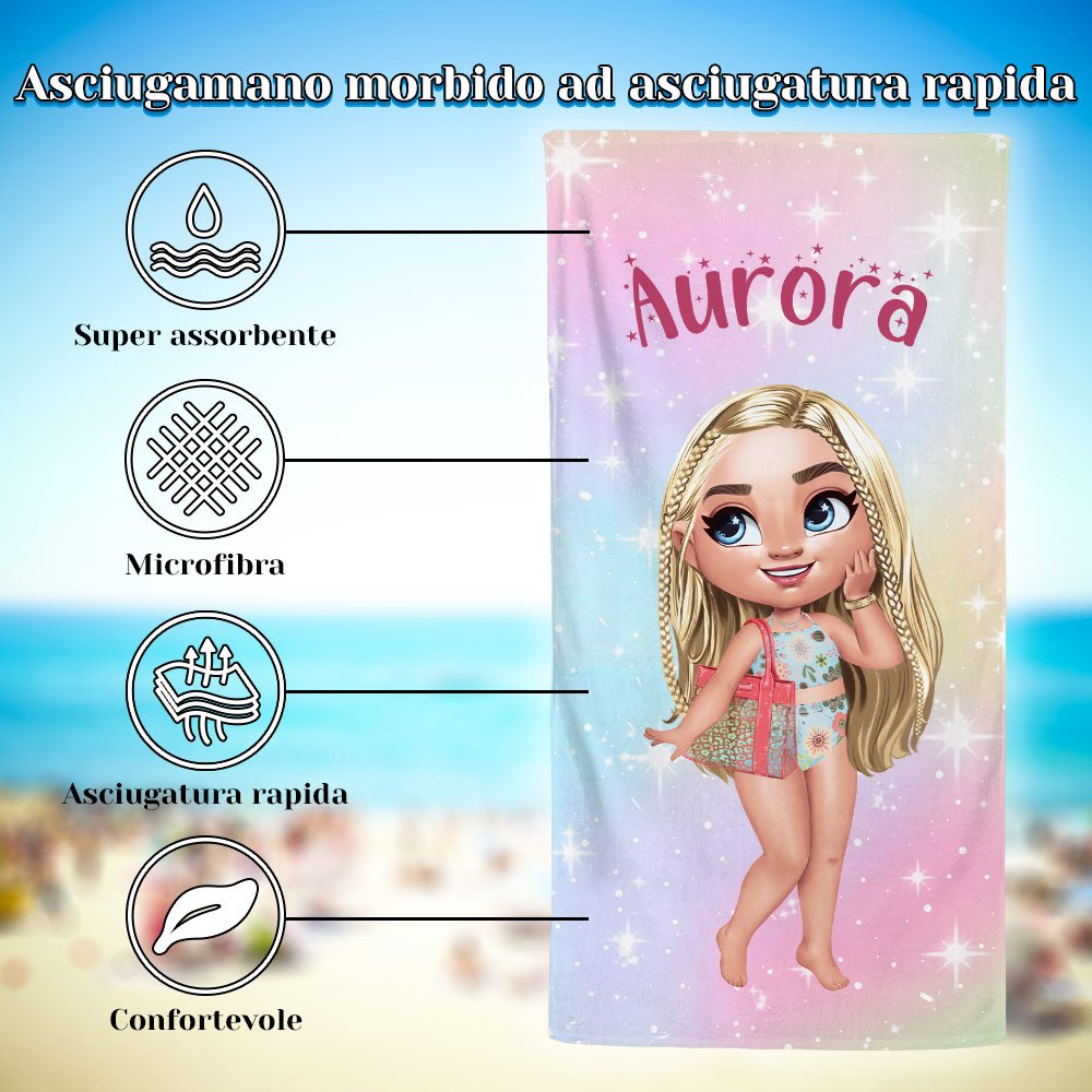 Questo asciugamano da spiaggia si distingue per uno sfondo a forma di stella sfumata e scintillante, personalizzabile con l'immagine di una ragazza carina e brillante, per un effetto visivo pieno di energia e stile giovanile. Puoi anche aggiungere il tuo nome, rendendo ogni asciugamano davvero unico ed esclusivo.