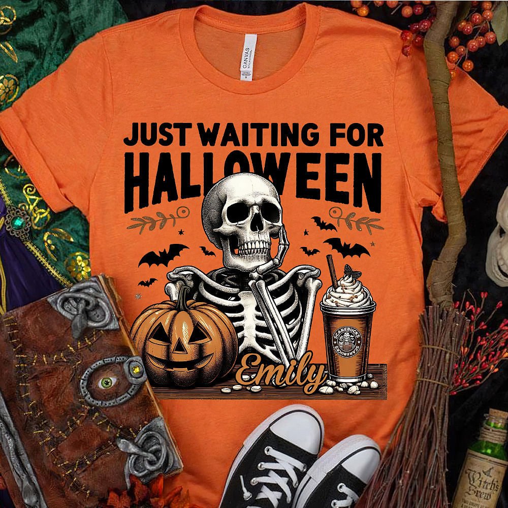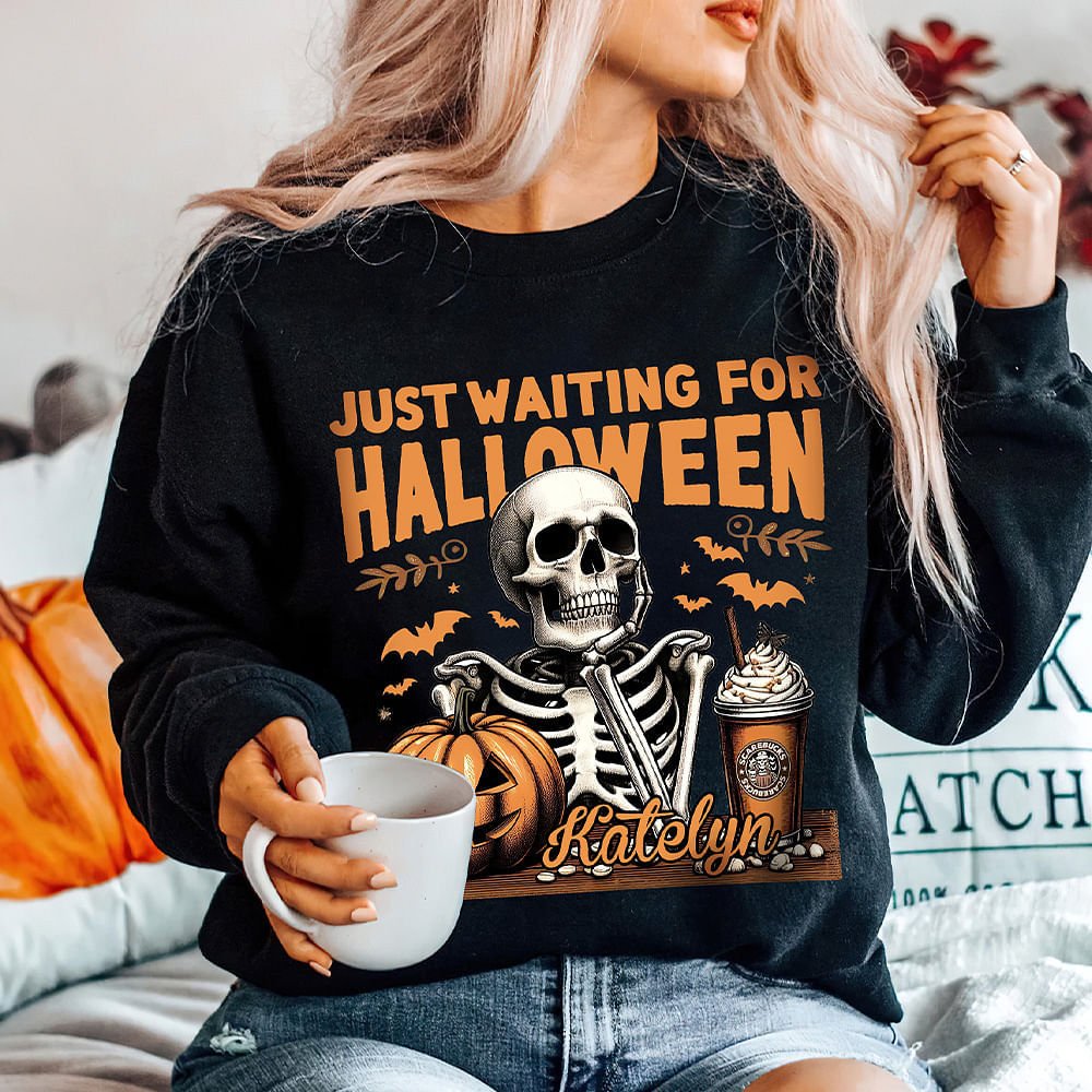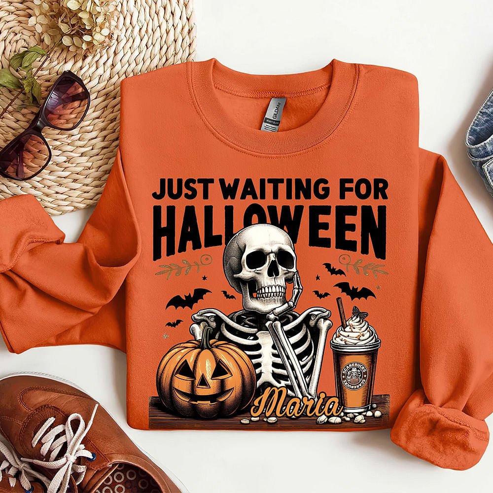 Con la frase "JUST WAITING FOR HALLOWEEN" e i simboli iconici di Halloween come teschi, zucche e pipistrelli, questa maglietta o felpa cattura l'essenza di Halloween, rendendola un must per chiunque ami celebrare questa inquietante festa.