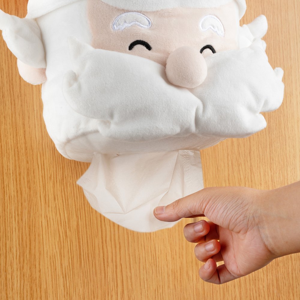 Questa decorazione per scatole di carta velina è basata su Babbo Natale e incorpora in modo unico tre diverse espressioni: sorridente, confusa e arrabbiata, aggiungendo un'atmosfera divertente alla festa. La carta velina può essere utilizzata come barba di Babbo Natale, e quando la si tira fuori sembra di tirare la barba di Babbo Natale, con un particolare divertimento da parodia. Ogni scatola di carta velina può aggiungere il nome della famiglia per renderla un'esclusiva decorazione natalizia.