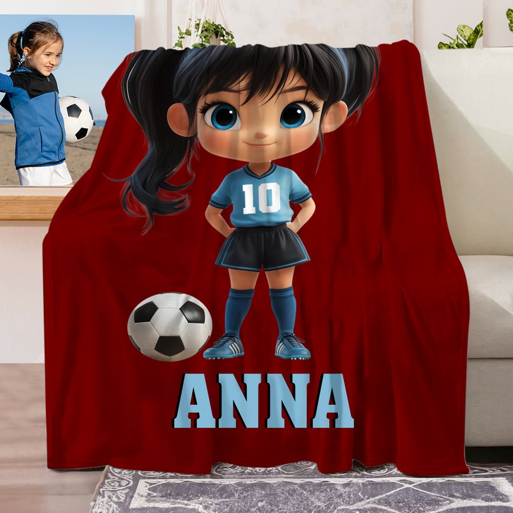 Questa coperta a tema calcio può essere personalizzata con l’immagine in stile cartone animato del tuo bambino, il suo nome e il suo numero, creando un ricordo unico che celebra la sua personalità e la passione per lo sport.